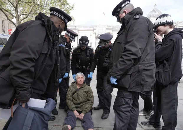في ساحة “ترافالغار”، وتحت شعارات “أنا أعارض الإبادة الجماعية.. أنا أدعم بال أكشن”، احتشد المئات في اعتصام سلمي افترشوا خلاله الأرض. وبدلاً من حماية حقهم المكفول قانوناً، شوهد ضباط الشرطة وهم يقتادون المتظاهرين قسراً، من بينهم رجل وسيدة من كبار السن، بل وصل الأمر إلى ملاحقة سيدة مسنة تستعين بـ “عكازين” لإبعادها عن موقع التظاهرة.