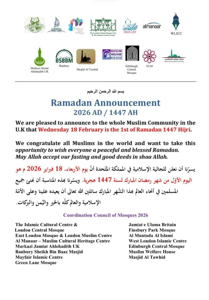 وجاء في نص البيان: “يسرنا أن نعلن للجالية الإسلامية في بريطانيا أن يوم الأربعاء، 18 فبراير 2026، هو اليوم الأول من شهر رمضان المبارك لسنة 1447 هجرية. وننتهز هذه المناسبة لنهنئ جميع المسلمين في أنحاء العالم بهذا الشهر المبارك، سائلين الله تعالى أن يعيده علينا بالخير واليُمن والبركات”.