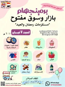 يسر اتحاد المصريين معًا الإعلان عن المعرض الثاني على التوالي بمدينة برمنغهام السبت 7 فبراير 2026، حيث تُعرض الأكلات المصرية الأصيلة والحلويات الشرقية وكعك العيد، ومستلزمات رمضان وملابس العيد والإكسسوارات ومستلزمات المحجبات مثل العبايات، وغيرها.