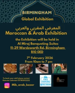 يستضيف المعرض المغربي والعربي فعالية ثقافية وتجارية كبرى في مدينة برمنغهام، تجمع بين التراث المغربي والعربي في مكان واحد، وتقدّم للزوار يومًا حافلًا بالتسوق والمأكولات والمنتجات التقليدية.