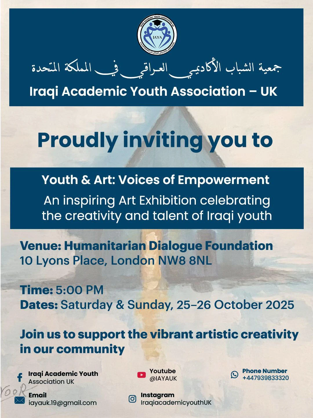 ينظمه Iraqi Academic Youth Association في لندن، ويعرض أعمالًا فنية مبتكرة لشباب عراقيين يعيدون تعريف الإبداع والهوية.