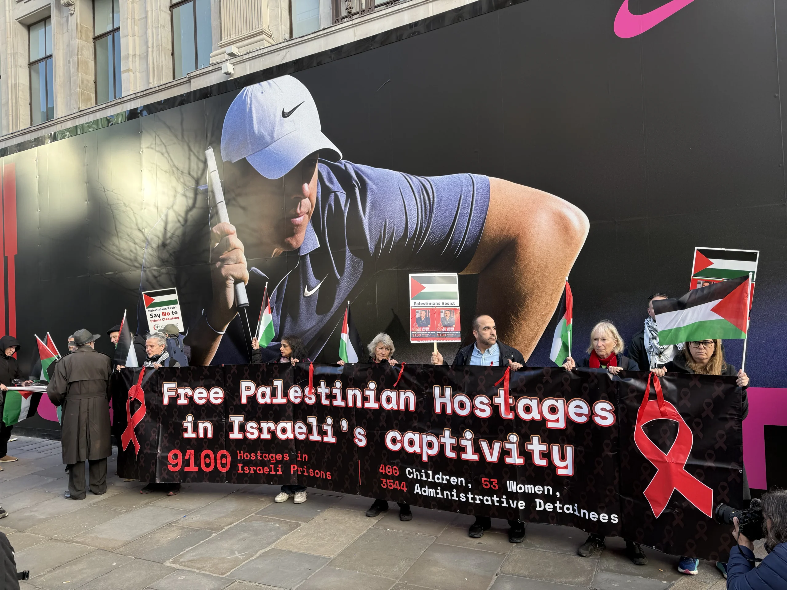 وفي مشهد رمزي لافت، قام المتظاهرون بلف أشرطة حمراء حول مداخل ومخارج محطة أكسفورد سيركس وعلى الدرجات المؤدية إلى المترو، في إشارة إلى العدد الكبير من الأسرى الفلسطينيين القابعين في سجون الاحتلال. كما عُلّقت صور الدكتور المعتقل حسام أبو صفية في أرجاء المكان، في رسالة تطالب بتدخل عاجل لحمايته وحماية جميع المعتقلين، بمن فيهم الأطفال والنساء الذين يتعرضون لشتى صنوف الانتهاكات.