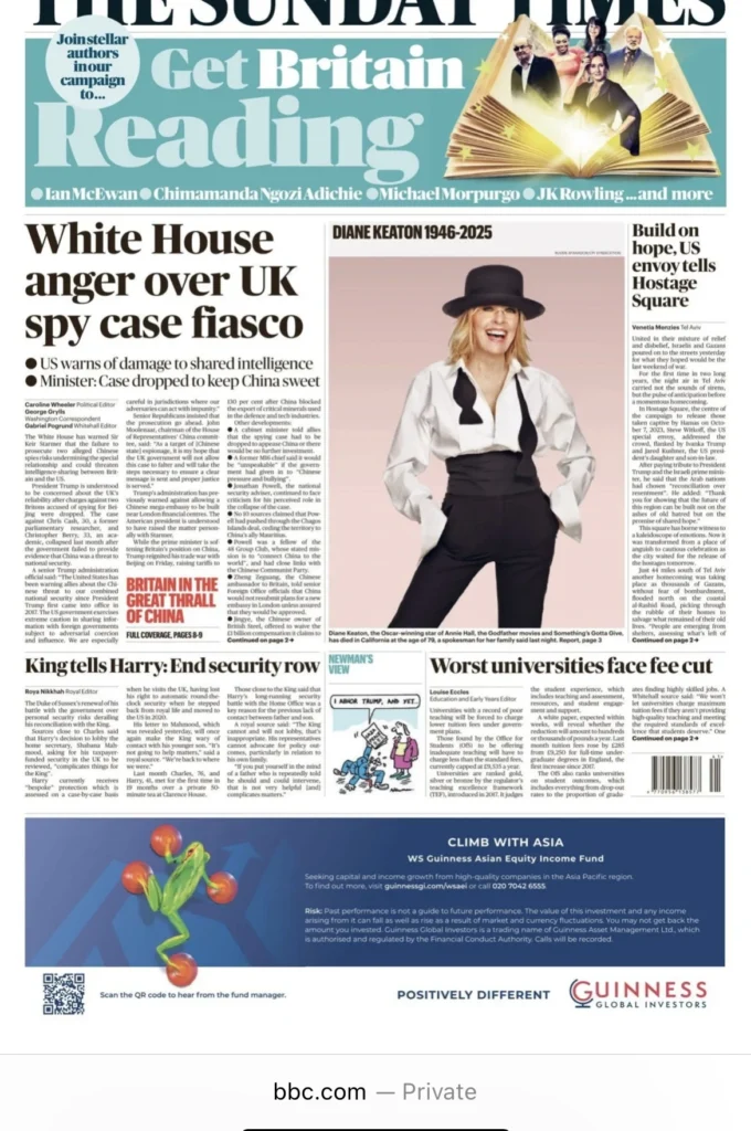 تتصدر الصحافة البريطانية اليوم توترًا دبلوماسيًا مع واشنطن على خلفية قضية تجسس مرتبطة بالصين، وتكهنات واسعة بشأن تغييرات ضريبية تمس المعاشات وثروات الشرائح الأعلى دخلًا، إلى جانب ملفات حساسة تطال العائلة الملكية وقضية وفاة مدان بجرائم خطيرة داخل السجن، فيما تحضر غزة بصور إنسانية على الصفحات الأولى.