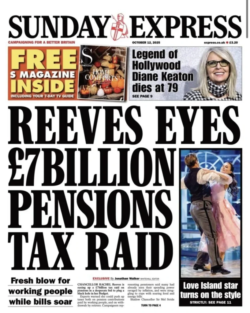 المستشارة رايتشل ريفز تُدرس “غارة ضريبية” بقيمة 7 مليارات باوند على معاشات التقاعد لسد فجوة في الموازنة، وفق خبراء نقلت عنهم الصحيفة. الطروحات تشمل زيادة الضرائب على المساهمات التقاعدية وعلى السحوبات التي يجريها المتقاعدون.