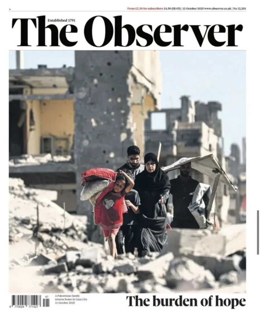 الصفحة الأولى تُفرد بالكامل لصورة عائلة فلسطينية تمشي بين الركام لدى عودتها إلى مدينة غزة، في إبراز للثمن الإنساني المستمر للحرب.