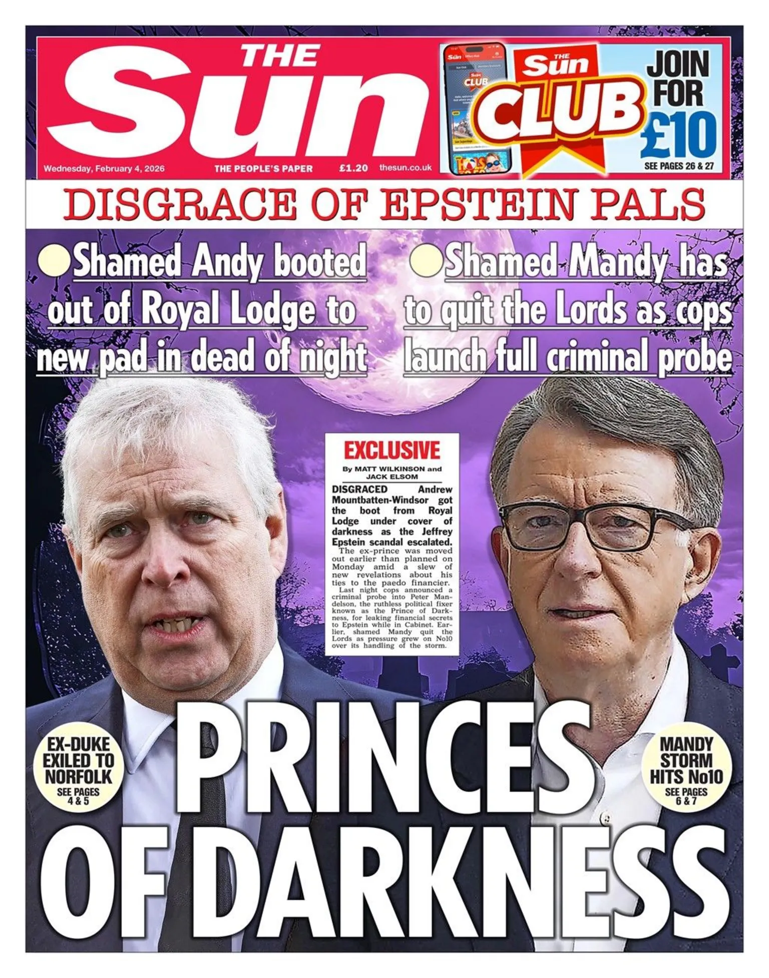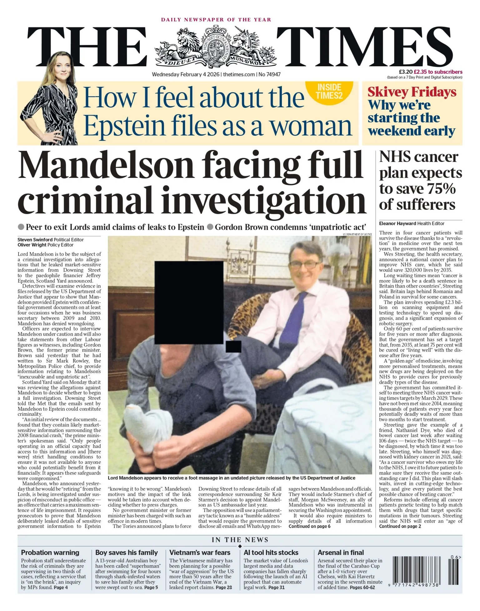 جاء في صدارة العناوين: «تحقيق شرطة العاصمة في قضية ماندلسون»، مع الإشارة إلى استقالته من مجلس اللوردات. وأوضحت الصحيفة أن التحقيق يشمل ادعاءات جديدة تفيد بأن إبستين أرسل للأمير أندرو امرأة في القصر الملكي عام 2010.