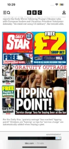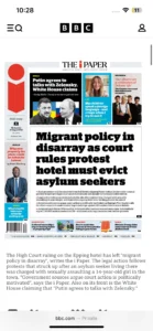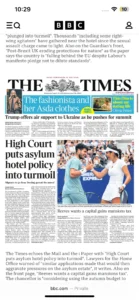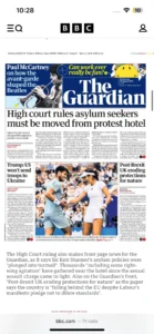 عنونت: “فنادق المهاجرين تواجه الإغلاق” بعد حكم المحكمة العليا الذي وضع خطط الحكومة الخاصة باللجوء في حالة من الاضطراب، كما أوردت وعود ترامب بتقديم دعم جوي لأوكرانيا “دون نشر قوات على الأرض”.
