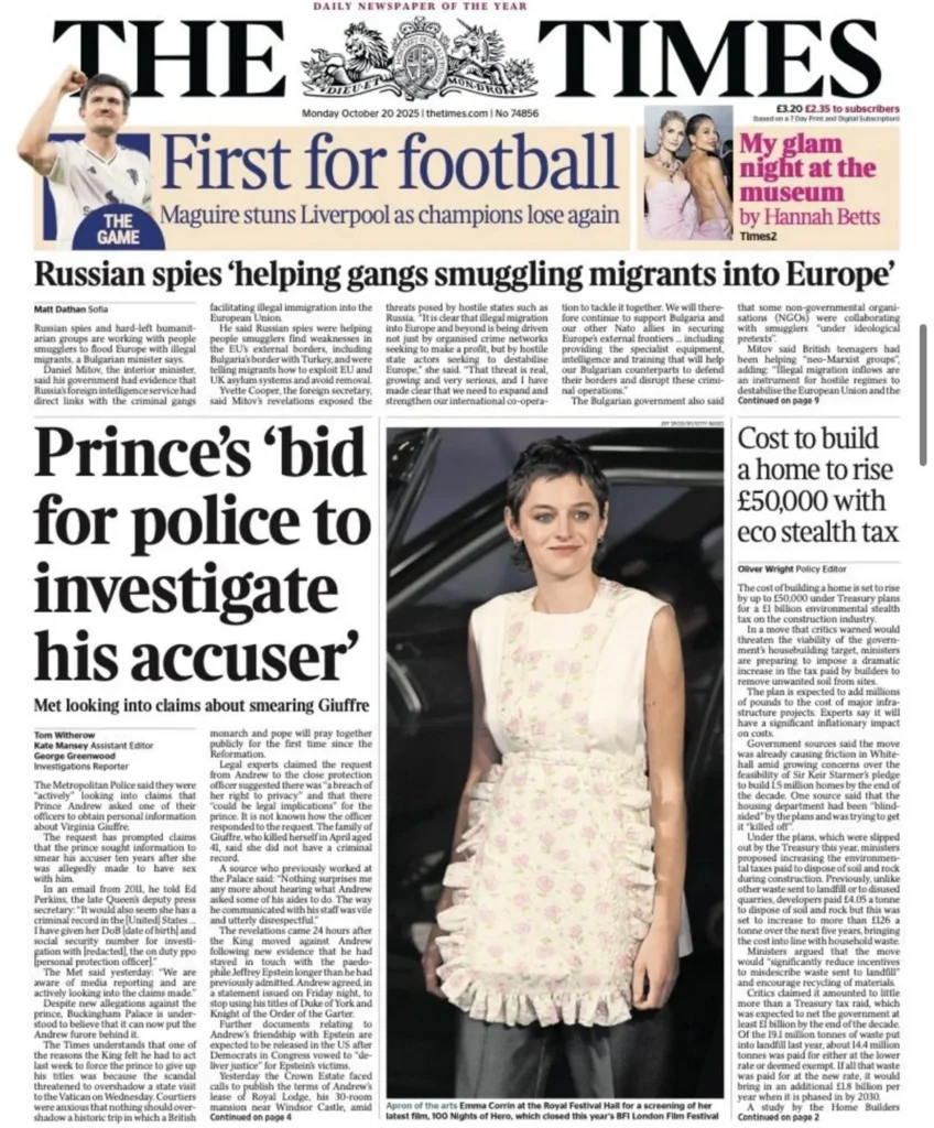 تشير الصحيفة إلى قصة «محاولة» الأمير أندرو دفع الشرطة للتحقيق مع مُتَّهِمَته، وتضيف تغطية موازية لتصريحات من وزير داخلية بلغاريا تزعم تعاون «جواسيس روس» و«منظمات إنسانية يسارية متشددة» مع مهرّبي البشر لـ«إغراق أوروبا» بمهاجرين غير نظاميين.