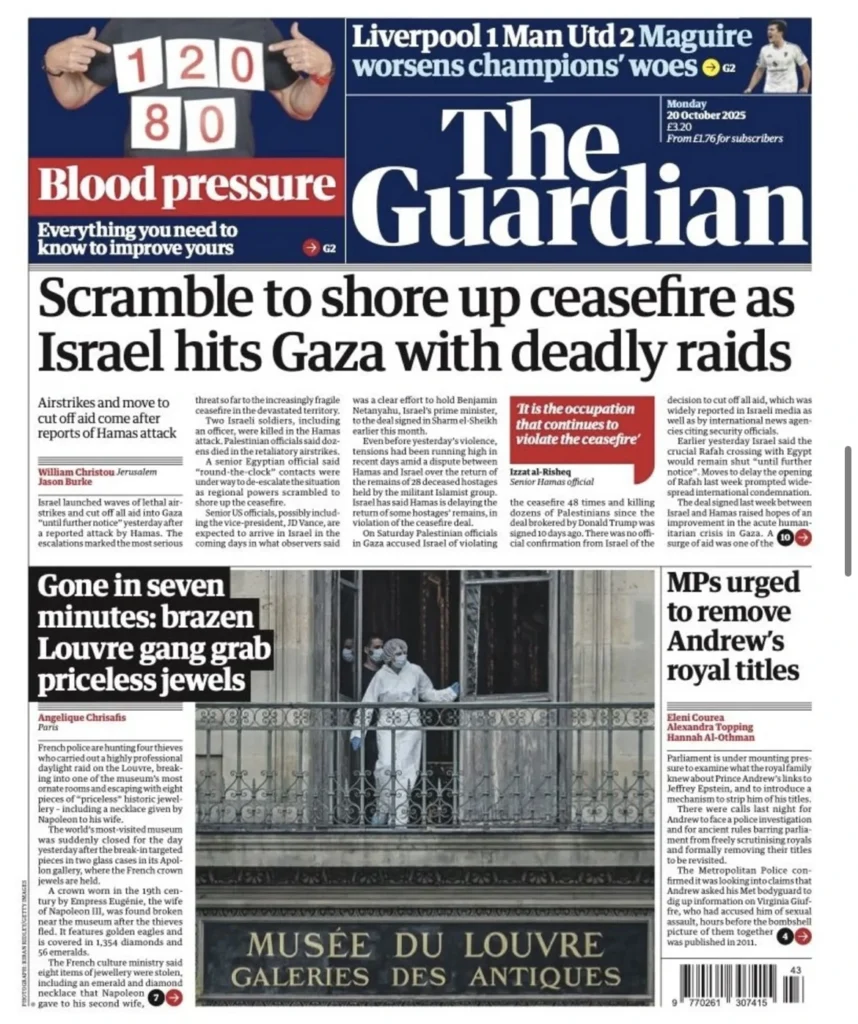 عنونت صحيفة الغارديان: «سباق لتدعيم الهدنة فيما تشن إسرائيل غارات دامية على غزة». وتذكر الصحيفة مقتل جنديين إسرائيليين في هجوم لحماس، وسقوط عشرات الفلسطينيين في «ضربات انتقامية». وتبرز على صفحتها الأولى تحقيق الشرطة الفرنسية في سرقة جريئة حدثت خلال سبع دقائق في متحف اللوفر، ويشمل ذلك عقدًا قُدِّم لزوجة نابليون.