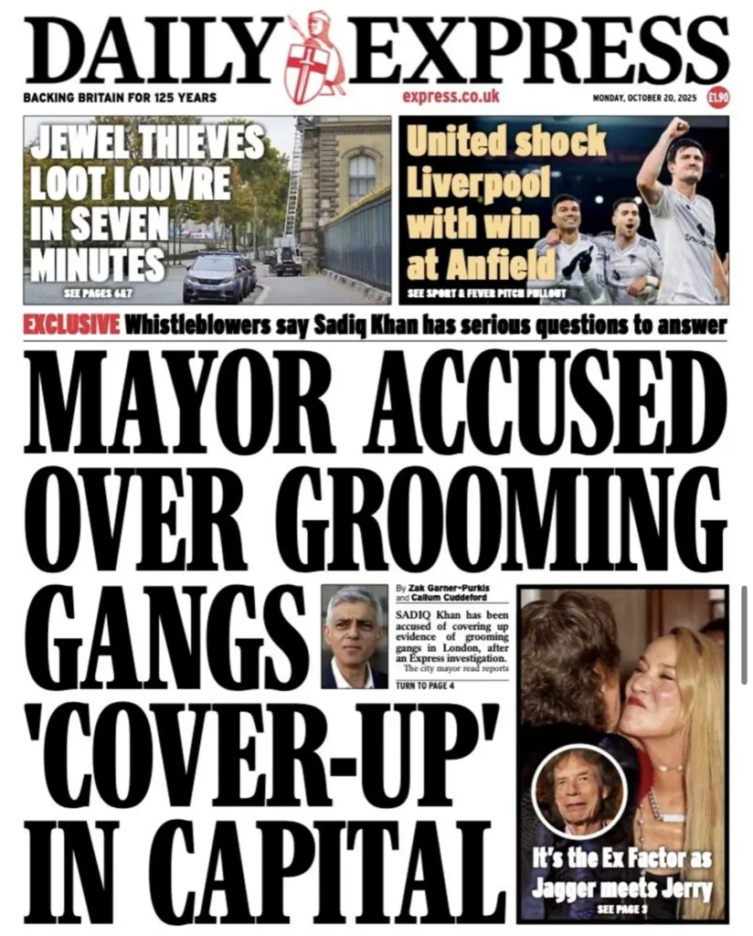 ذكرت الصحيفة أن عمدة لندن صادق خان اطّلع على تقارير عن حوادث اغتصاب لفتيات صغيرات في فنادق على يد مجموعات من الرجال، مع أنه كان ينفي علنًا وجود «عصابات استدراج» في العاصمة. وتنقل عن المُبلِّغة ماجي أوليفر أن الحالات حملت «نمطًا مشابهًا» لفضيحة روشديل. وتشير إلى أن عمدة لندن وشرطة العاصمة ينكران وجود تقارير مماثلة لملفات روثرهام وروشديل في لندن.
