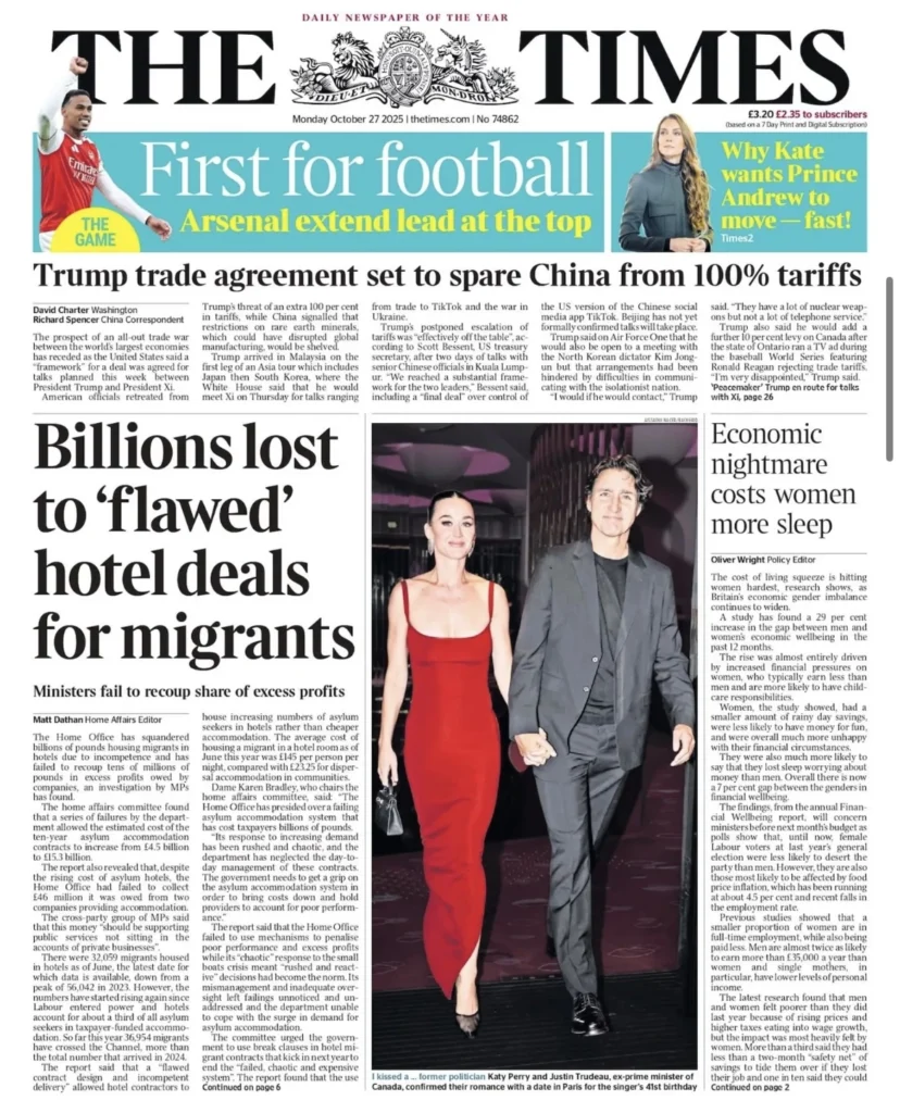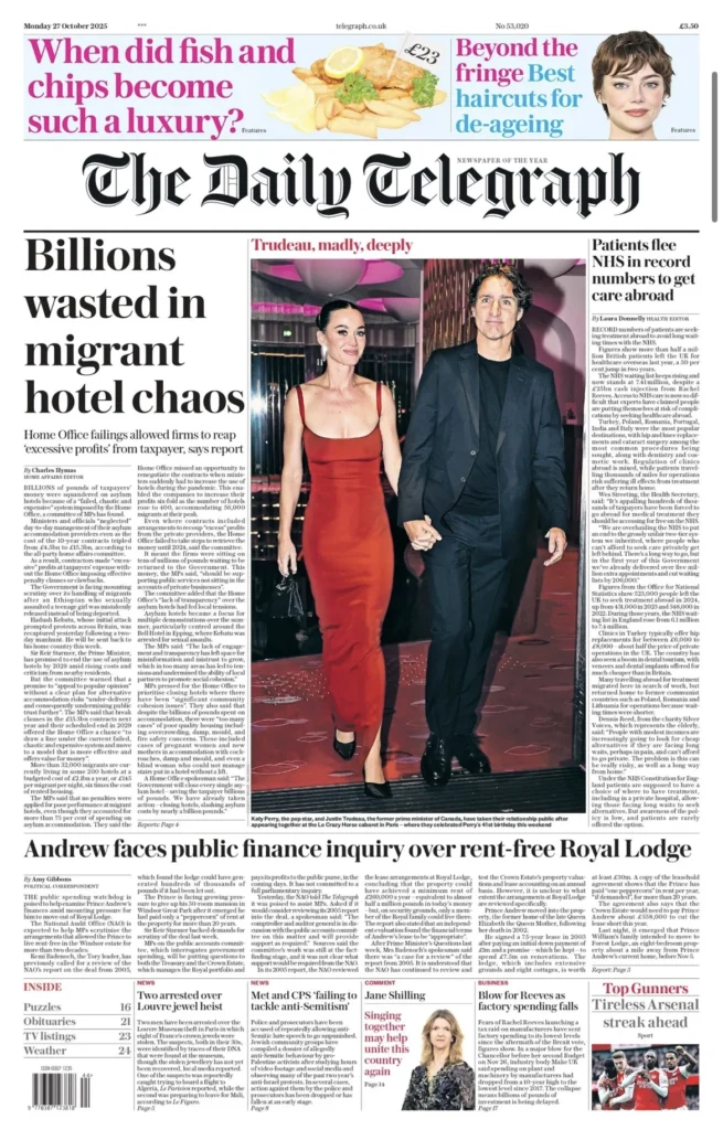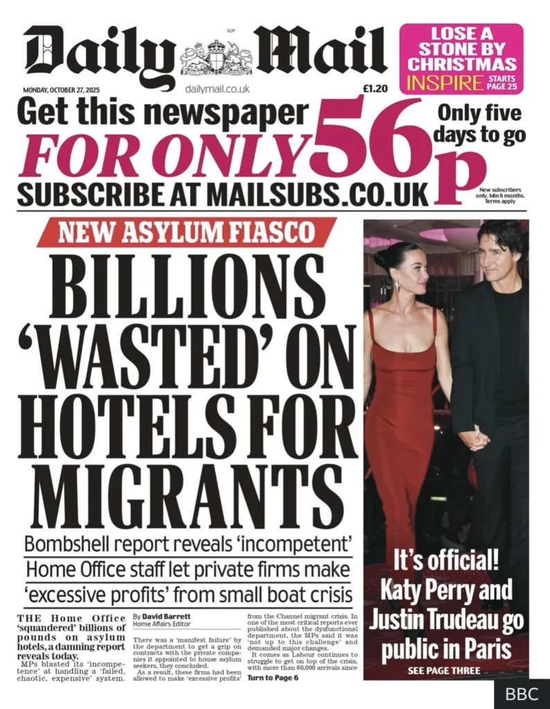 العنوان الرئيسي: «مليارات أُهدرت على فنادق المهاجرين» في ما تصفه الصحيفة بـ«فضيحة لجوء جديدة». تقرير نواب لجنة الشؤون الداخلية يصف إدارة وزارة الداخلية لنظام الهجرة بأنها «فشل واضح». وعلى الغلاف أيضًا مادة منوعات تواكب «رسمية» علاقة المغنية كايتي بيري ورئيس الوزراء الكندي السابق جاستن ترودو، مع تعليق على صورة الثنائي: «It’s official!».