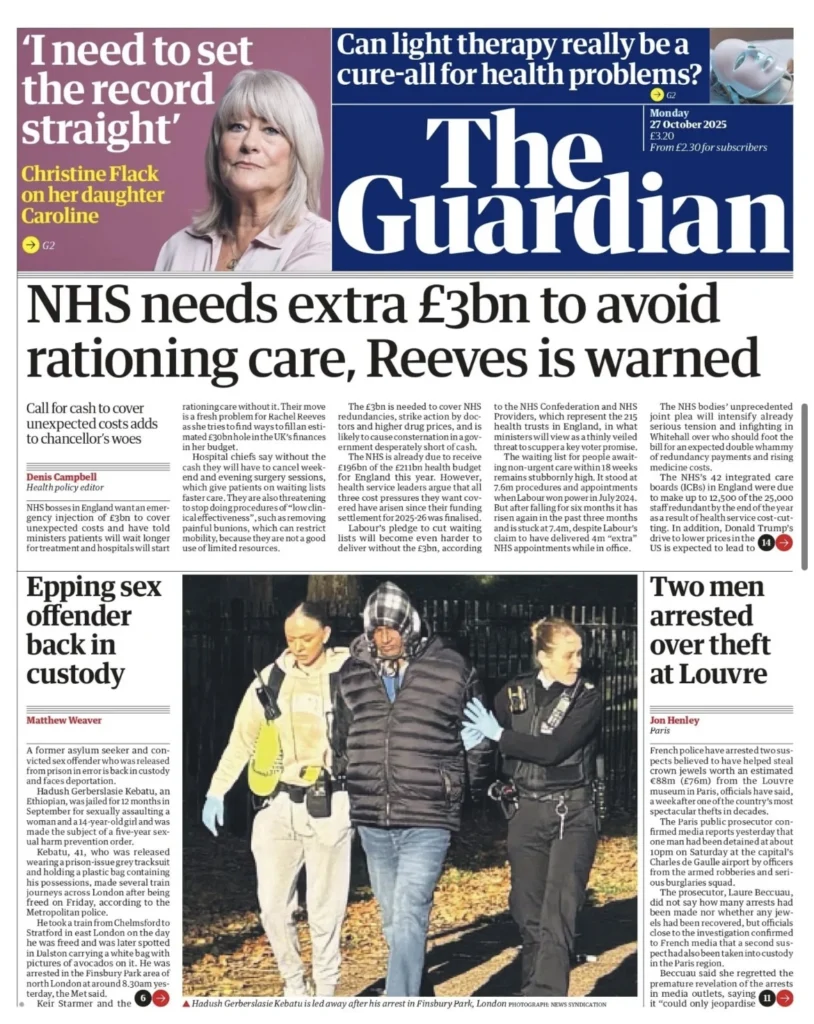 الصحيفة تعرض تحذيرات موجهة إلى وزيرة الخزانة راشيل ريفز بأن هيئة الصحة الوطنية بحاجة إلى «3 مليارات باوند إضافية لتفادي تقنين الرعاية». رؤساء الهيئة يحذرون من أن المرضى «سينتظرون مدة أطول للعلاج» ما لم تُضَخّ أموال طارئة. واحتلت صورة «مُدان إبينغ الجنسي» هدوش كباتو مساحة كبيرة من الصفحة الأولى عقب توقيفه الأحد، بعد إفراج خاطئ عنه رغم إدانته بالاعتداء على فتاة (14 عامًا) وامرأة أثناء إقامته في فندق لطالبي اللجوء.