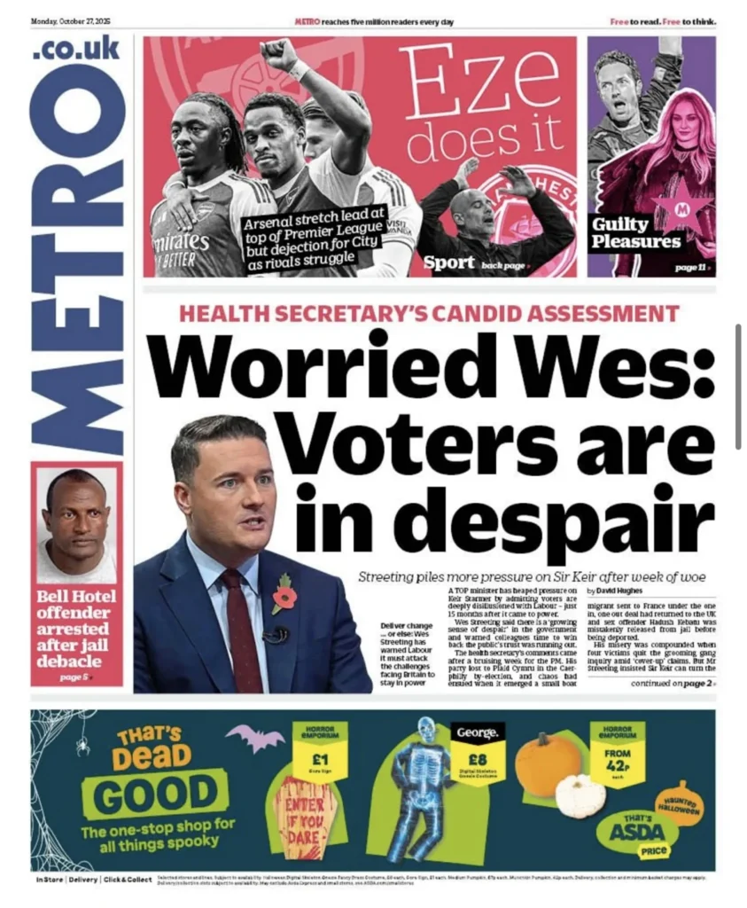 العنوان العريض: «Worried Wes». الوزير ويس ستريتينغ يتحدث عن «تصاعد الإحساس باليأس داخل الحكومة»، محذرًا زملاءه من أن الوقت «ينفد» لاستعادة ثقة الجمهور.