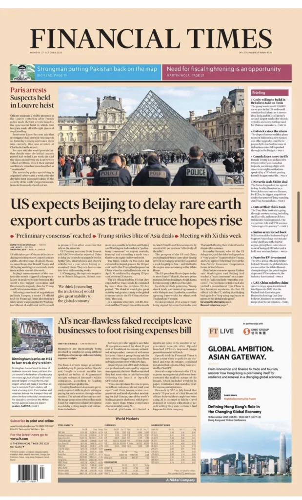 مسؤولون أمريكيون «يتوقعون تأجيل الصين طرحَ ضوابط شاملة على صادرات العناصر النادرة»، عقب مفاوضات نهاية الأسبوع في كوالالمبور «أحيت الآمال» بأن يتوصل دونالد ترامب وشي جينبينغ إلى تمديد هدنة تجارية. وتُغطي الصحيفة كذلك توقيف مشتبهين في سرقة متحف اللوفر، أحدهما في مطار شارل ديغول، بعد أن «فرّ أربعة لصوص بثماني قطع من الحُلي الملكي».