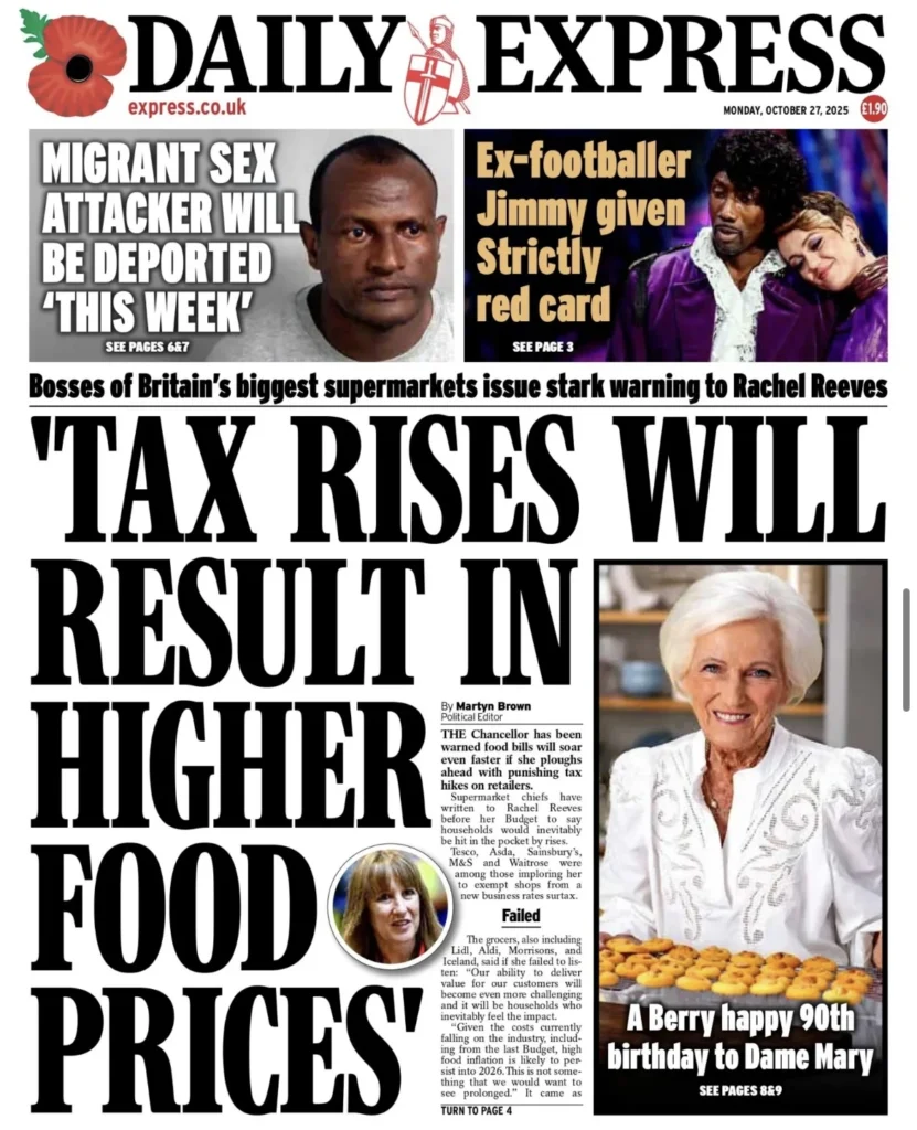 العنوان الرئيسي: «زيادات الضرائب ستؤدّي إلى أسعار غذاء أعلى». سلاسل كبرى مثل تيسكو، أسدا، سينسبريز، ماركس آند سبنسر، وويتروز «تناشد» وزيرة الخزانة استثناء المتاجر من «ضريبة إضافية على الأعمال». كما يظهر على الغلاف تعهّد وزير العدل ديفيد لامي بأن «مهاجمًا جنسيًا من المهاجرين سيُرحّل هذا الأسبوع».