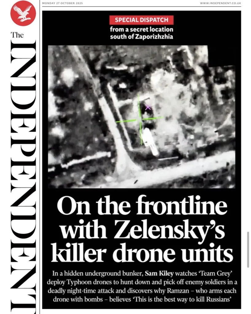 «تغطية خاصة» من «موقع سرّي» في أوكرانيا بعنوان: «على الخطوط الأمامية مع وحدة الطائرات المسيّرة القاتلة التابعة لزيلينسكي». مراسل الصحيفة شاهد فريقًا ينشر مسيّرات «تيـفون» لاصطياد جنودٍ معادين في هجومٍ ليلي من مخبأٍ تحت الأرض جنوب زابوريجيا.
