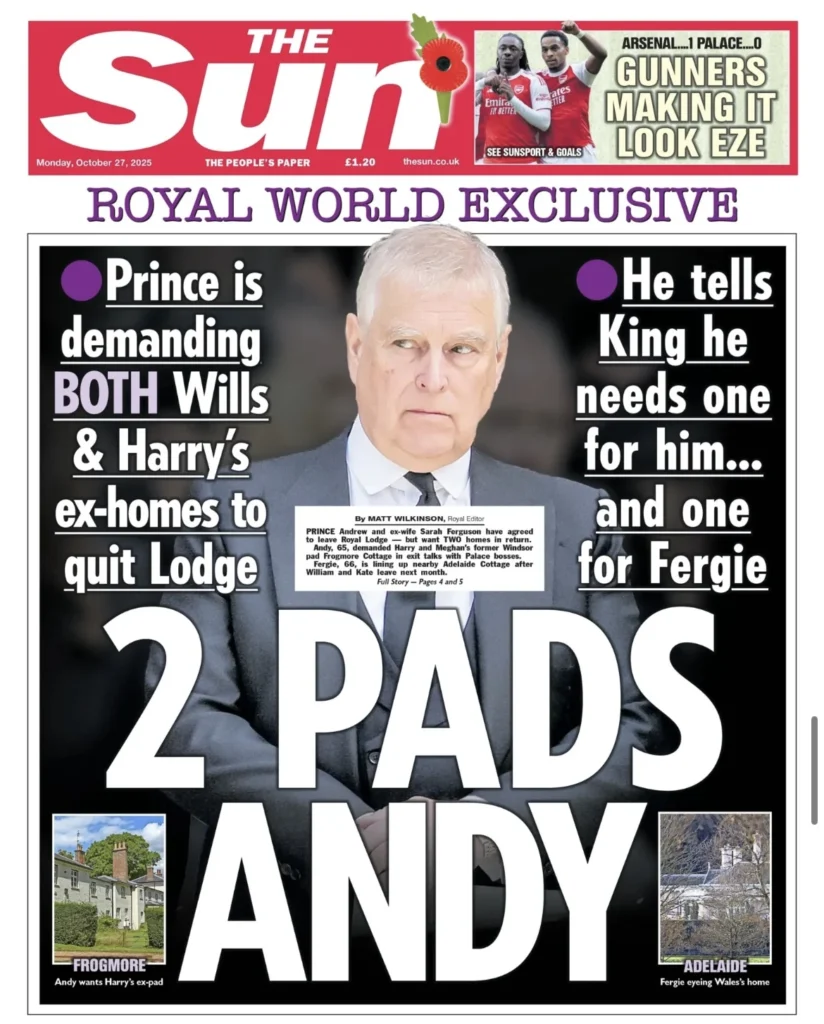 «الأمير أندرو يطالب بمنزلي ويليام وهاري السابقين» للانتقال من «رويال لودج». الصحيفة تقول إن أندرو أبلغ الملك بأنه «بحاجة إلى واحد له… وواحد لفيرغي».