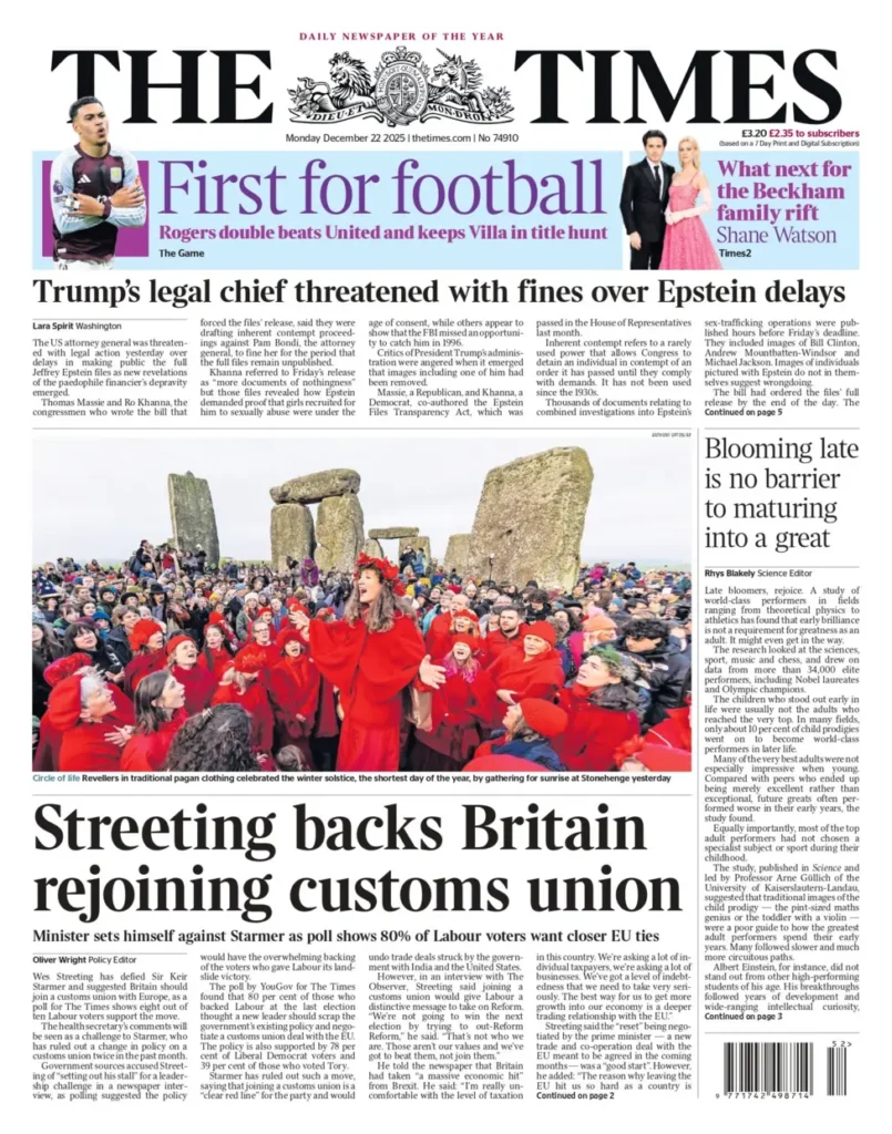 أبرزت صحيفة التايمز صورة مشابهة من الاحتفال بالتقلبات الشتوية، مع تقرير أفاد بأن وزير الصحة، ويس ستريتينغ، اقترح أن تنضم بريطانيا إلى اتحاد جمركي مع أوروبا، رغم أن رئيس الوزراء كير ستارمر استبعد أي تغيير في السياسة الرسمية لبريطانيا بهذا الخصوص.