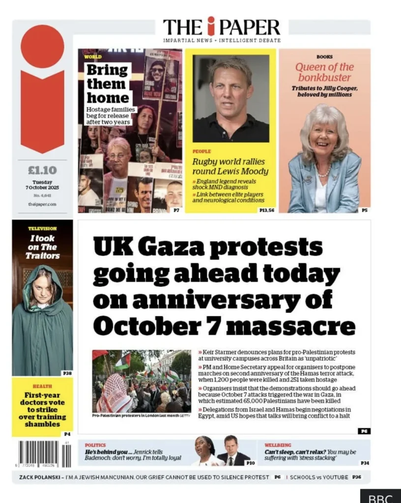 صحيفة The i تشير إلى أن فعاليات مناصرة غزة «تُقام اليوم» تزامنًا مع ذكرى 7 أكتوبر، مع الإشارة إلى مرور عامين على هجوم حماس على إسرائيل. رداً على ذلك، دان رئيس الوزراء السير كير ستارمر تلك الفعاليات واعتبرها «غير وطنية».