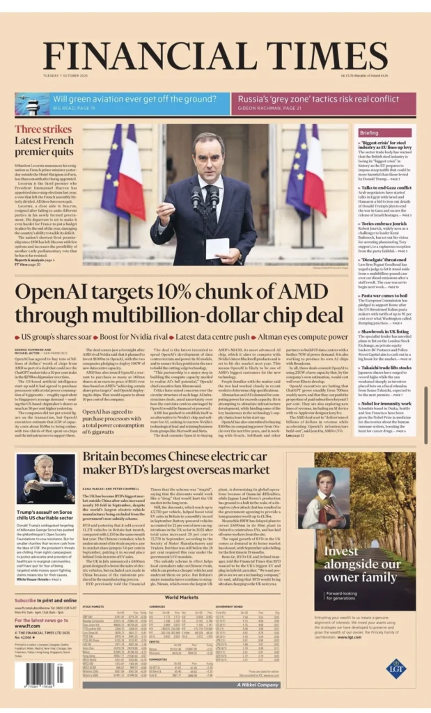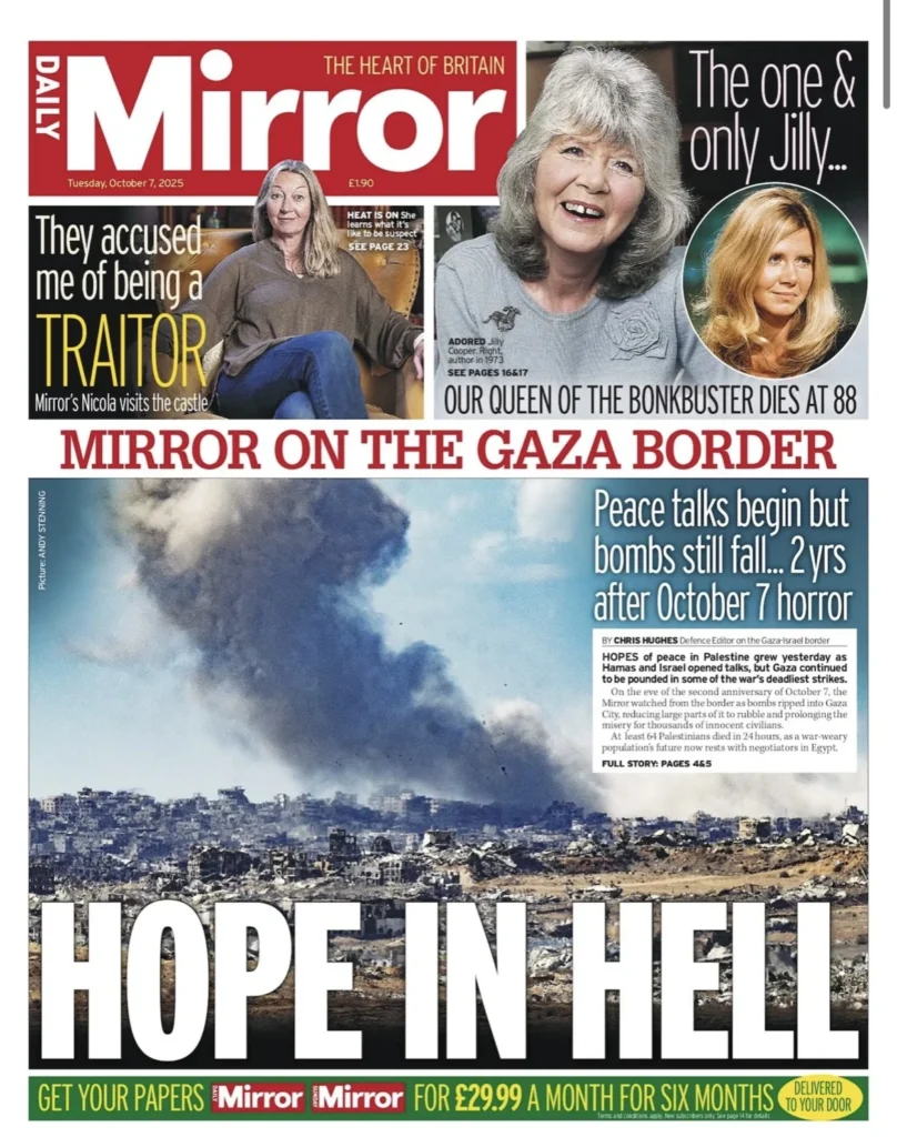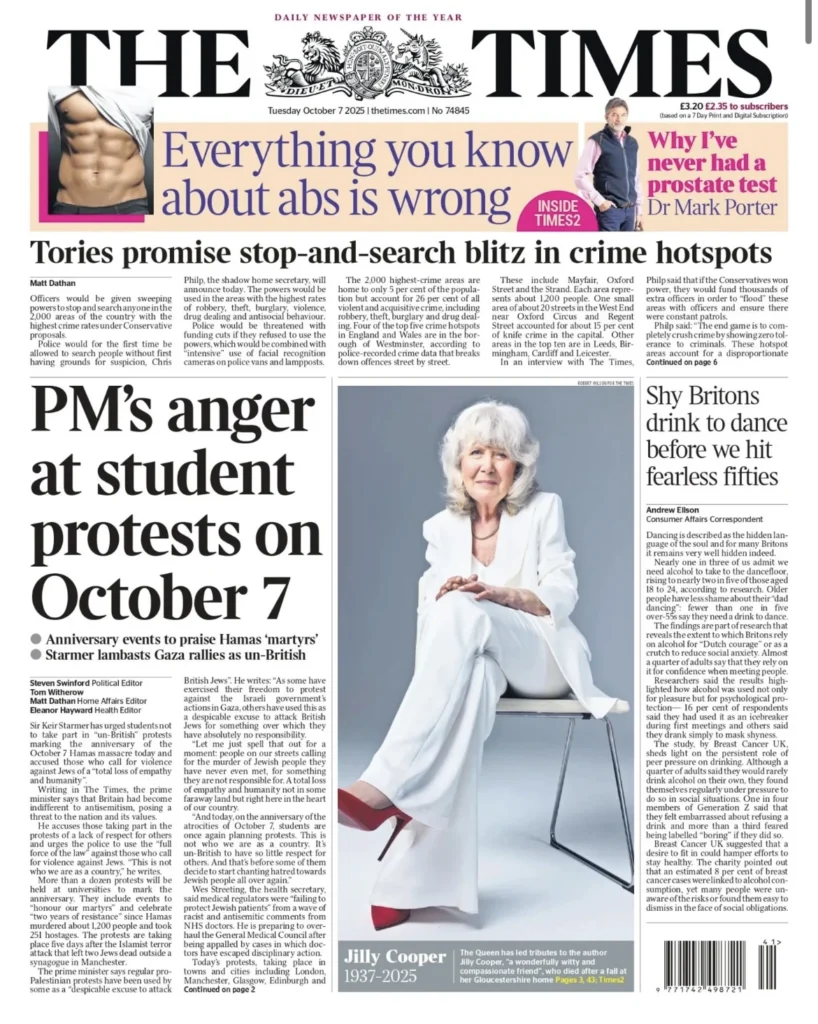 تتصدّر ذكرى هجوم 7 تشرين الأول/أكتوبر المشهد الصحفي البريطاني هذا الصباح، بينما تملأ صورة الأديبة الراحلة دايم جيلي كوبر معظم الصفحات الأولى. في صفحات السياسة والشارع يتقاطعان التنديد الرسمي والاحتجاج الشعبي، وفي الاقتصاد والتكنولوجيا تبرز صفقة كبيرة بين شركتيّ تكنولوجيا تؤثر على سوق رقائق الحاسوب.
