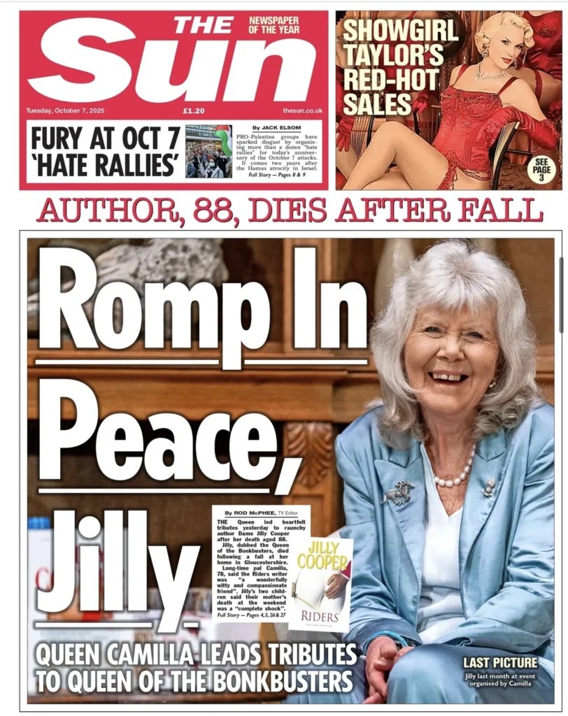 تختار صحيفة The Sun عنواناً لوداع الأديبة: «ارقدي في سلام، جيلي» مع صورة كبيرة للأديبة، وتبرز أيضاً تغطية لاحتجاجات مناصرة فلسطين التي وصفتها الصحيفة بأنها أثارت «سخطاً» لدى بعض الأطراف، إلى جانب أخبار ترفيهية وخفيفة.