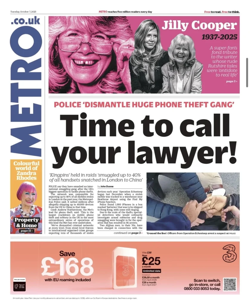تتقدم صحيفتا Daily Mail وDaily Express بملفات عن تفكيك ما وُصف بـ«أكبر عصابة للهواتف» وعمليات مداهمة واسعة، بينما تنقل Daily Mail أيضاً تحية الملكة كاميلا لذكريات دايم جيلي كوبر.