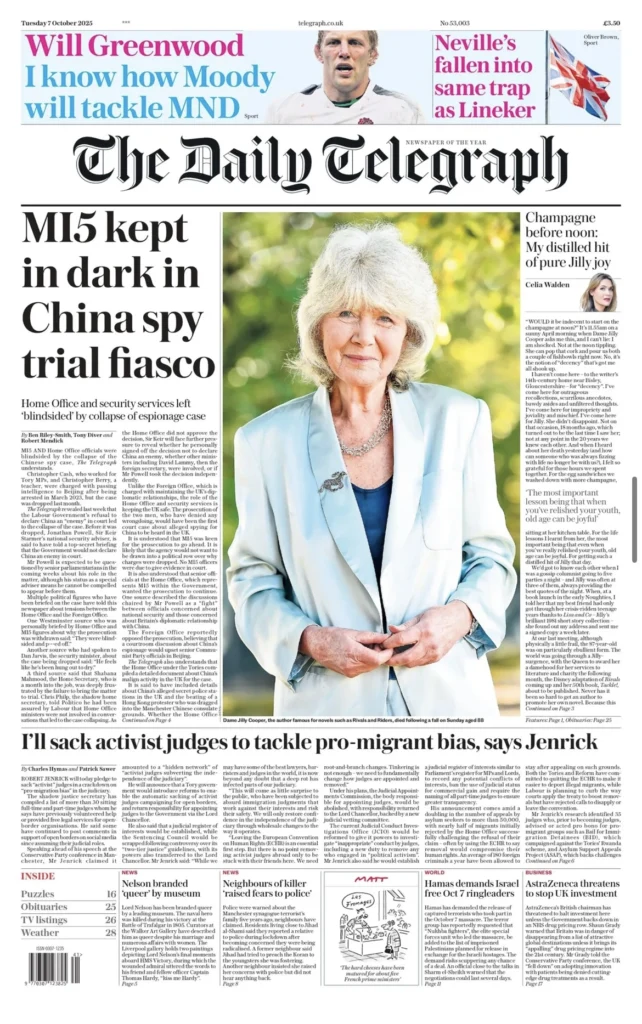 تسلط التلغراف الضوء على تداعيات قضية تجسّس مرتبطة بالصين، وتقول إن أجهزة أمنية رأت نفسها «مفاجأة» بانهيار القضية، إلى جانب تصريحات من مسؤولين معارضين يعدّون بإجراءات قضائية تجاه ما يسميه بعضهم «تمايل القضاء في قضايا الهجرة». يظهر على صفحتها الرئيسية كذلك تكريم لكوبر.