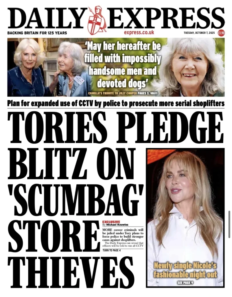تبرز الصحيفة وعود حزب المحافظين بخطط صارمة ضد سرقة المتاجر والجريمة المتكررة، مع عناوين قوية حول تشديد الإجراءات لردع المجرمين.