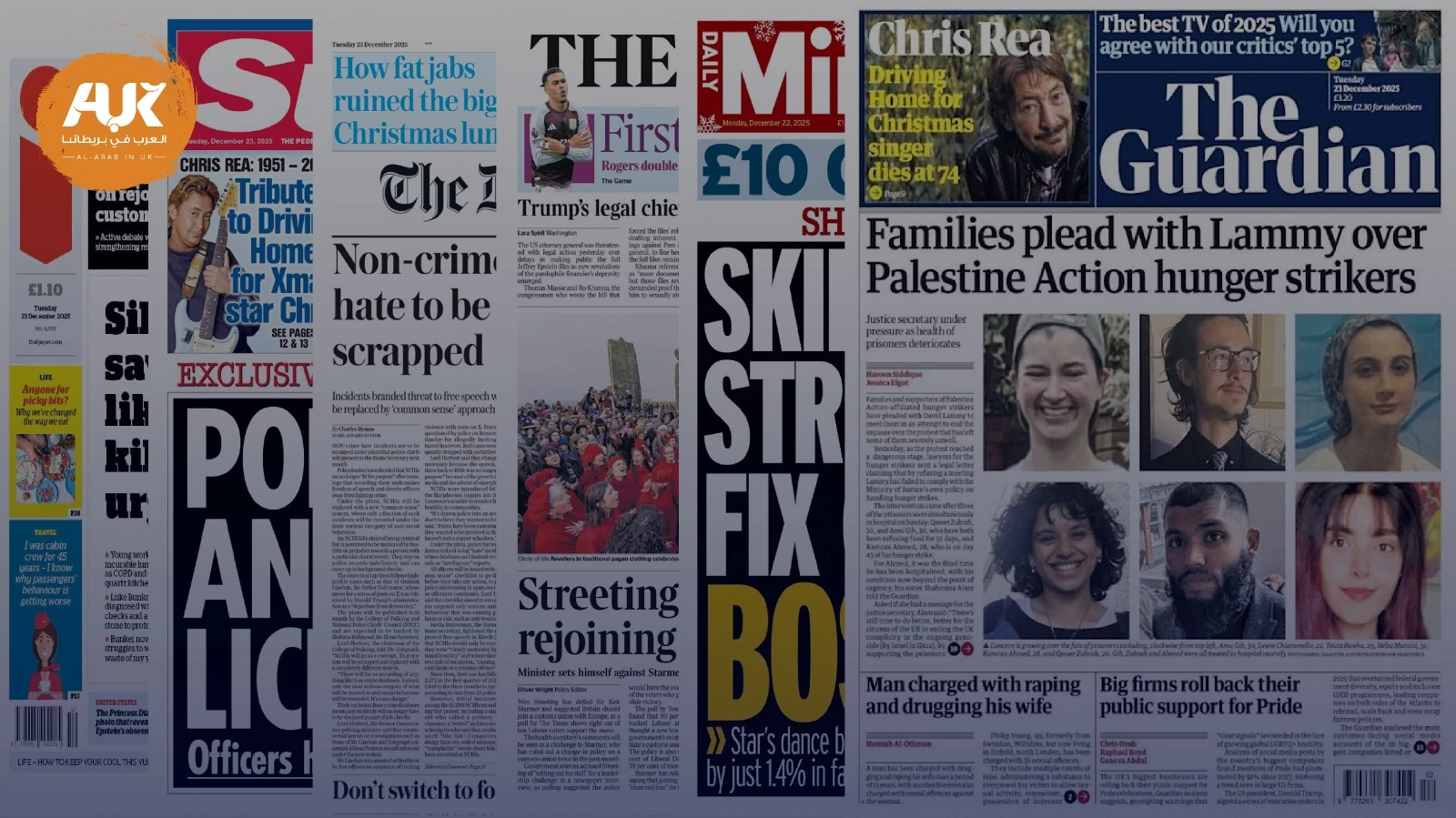هيمنت موضوعات متنوّعة على الصفحات الأولى للصحف البريطانية الصادرة اليوم الثلاثاء 23 كانون الأول/ ديسمبر 2025، تراوحت بين أخبار الفن والعائلة المالكة، وقضايا سياسية وحقوقية، إلى جانب ملفات اقتصادية واجتماعية وصحية، عكست مجتمعةً انشغالات الرأي العام البريطاني في الأيام الأخيرة من العام.