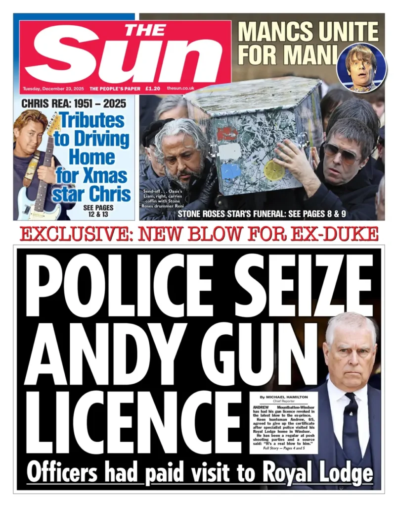 تحدثت صحيفة الصن عن «ضربة جديدة» لأندرو ماونتباتن-ويندسور، مشيرة إلى أن رخصة حمل السلاح الخاصة به سُحبت رسميًا. وأوضحت الصحيفة أن الأمير السابق وافق على التخلي عن الرخصة بعد زيارة من الشرطة المتخصصة إلى مقر إقامته في النزل الملكي.
