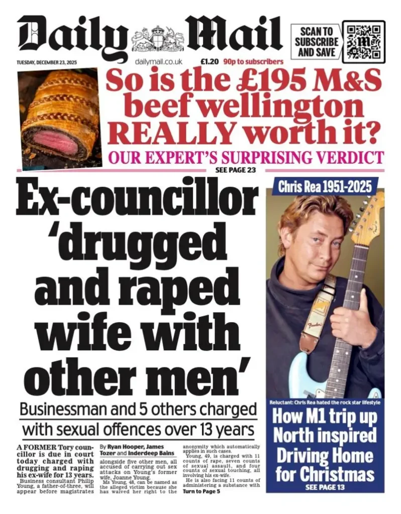 وفي الشأن القضائي، تصدرت ديلي ميل خبر توجيه اتهامات خطيرة لزوج وخمسة رجال آخرين، تتعلق بسلسلة من الجرائم الجنسية ضد زوجته السابقة، وقعت على مدى 13 عامًا، في قضية أثارت صدمة واسعة.
