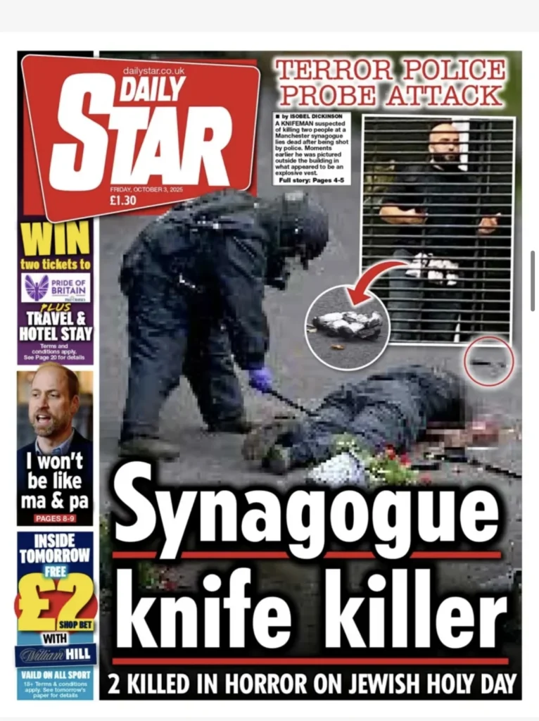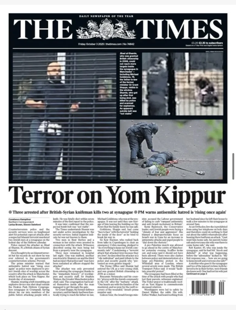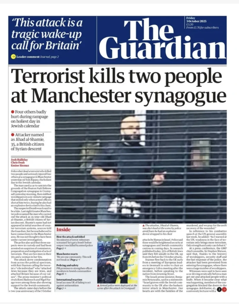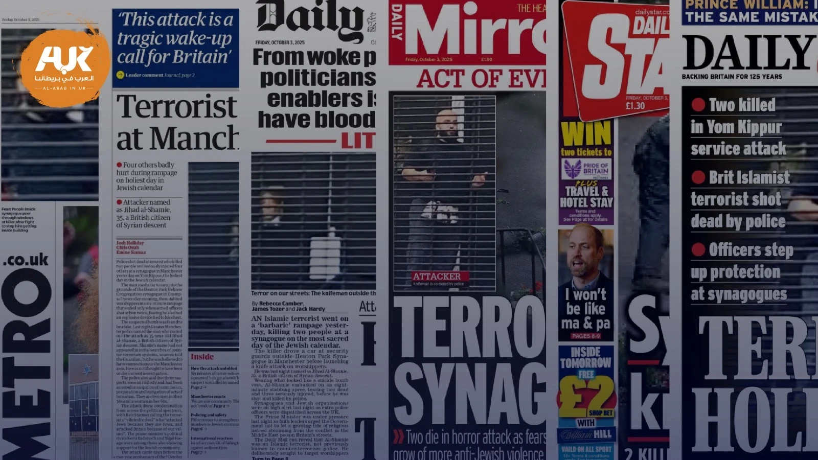 هزّ حادث دموي مواقع العبادة اليهودية في مانشستر الصدارة في صحف الجمعة، فيما تباينت زوايا التغطية بين وصف بطولة محليّة وروايات ساعات الرعب وردود فعل سياسية داخلية وخارجية. نعرض أدناه ما أبرزته كل صحيفة باسمه، مع مراعاة الحساسية والحقائق المتاحة، وتقديم موقف واضح لمنصة «العرب في بريطانيا».