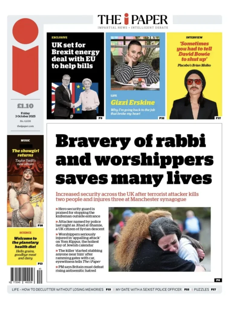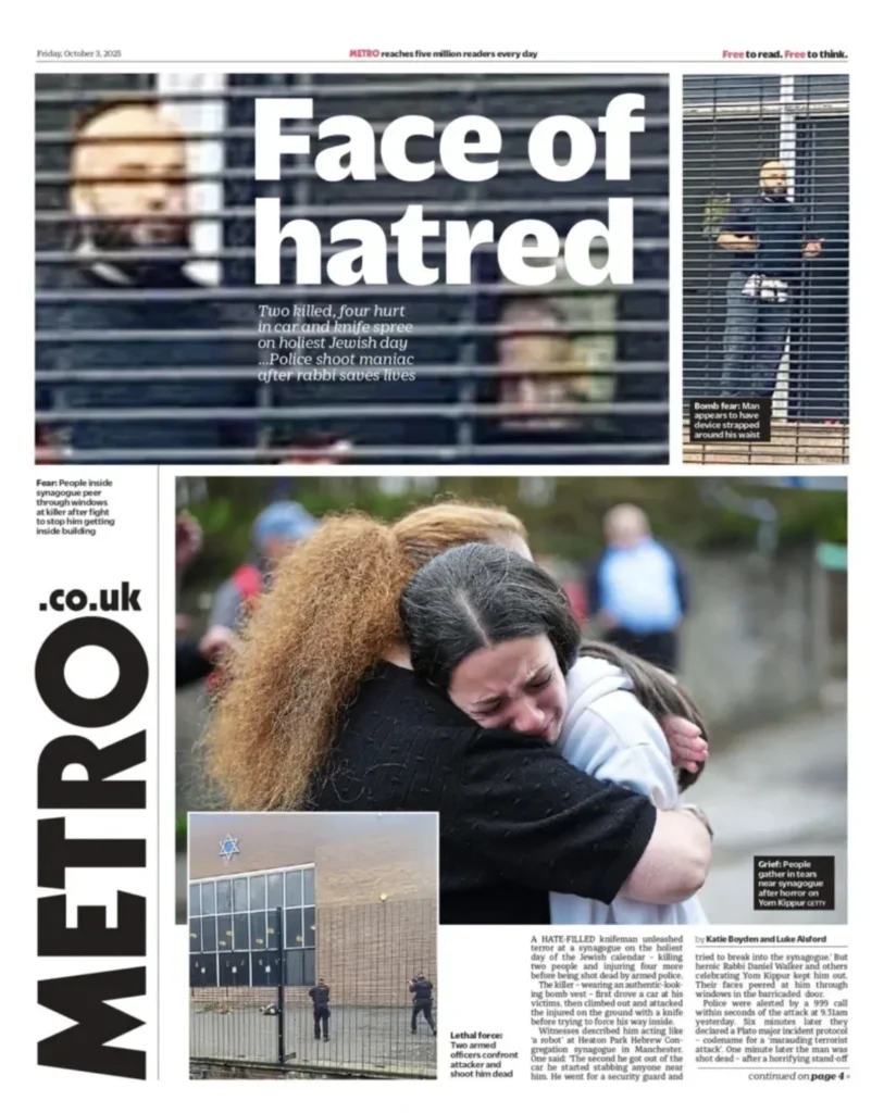 «طعن بسيارة» و«وجه الكراهية» تتصدران صفحات المترو التي تبرز هجومًا مزدوجًا بسيارة وسكين على كنيس في مانشستر في يوم مقدّس لدى اليهود. الصحيفة تنقل شهادة شهود وصفوا رجلًا يتحرّك كأنه «روبوت» قبل أن يقترب من الكنيس، وتسلّط الضوء على «بطولة» الحاخام دانيال ووكر وأصحاب المكان الذين نجحوا في تحصين الأبواب وصدّ المهاجم المشتبه به عن دخول مكان العبادة.