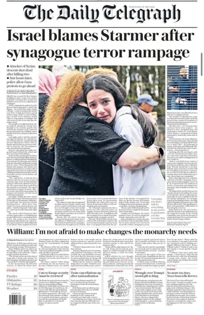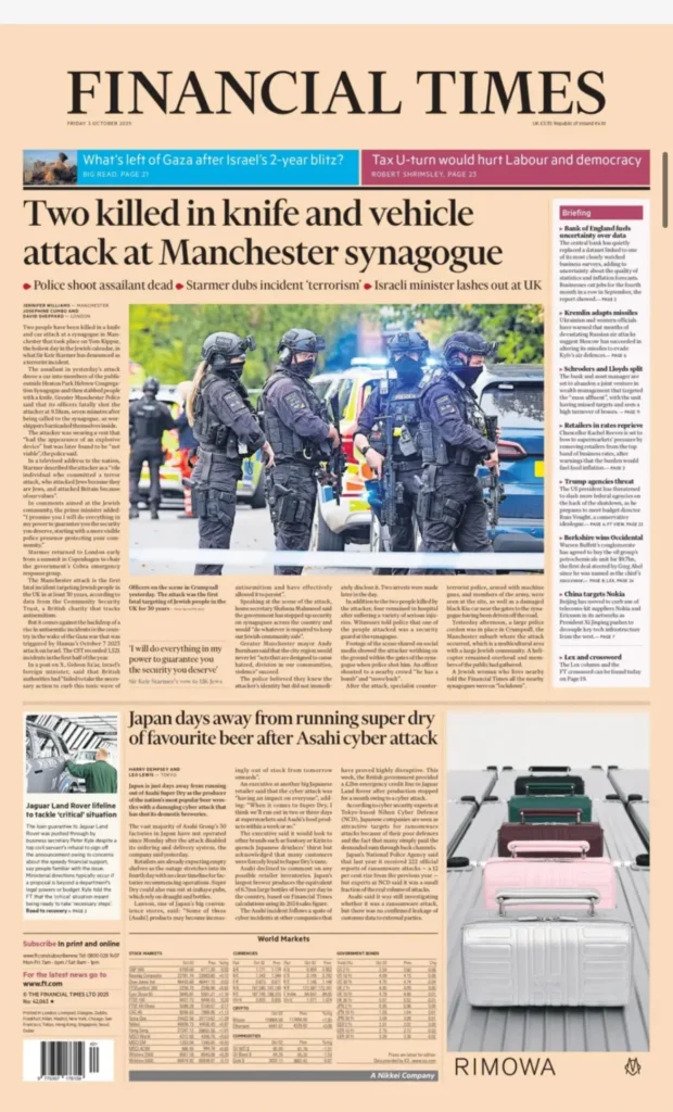 فاينانشال تايمز تركّز على ردة فعل الحكومة: رئيس الوزراء سير كير ستارمر عاد إلى لندن مسرعًا من زيارة خارجية وأعلن أن الحادث «حادث إرهابي» خلال خطاب مرئي للأمة. الصحيفة تغطي كذلك قضايا أخرى موازية في الصفحات الأولى، بينها تقارير عن هجمات إلكترونية أثّرت على صناعة الجعة اليابانية وخطر نفاد منتج شعبي في الأسواق المحلية.