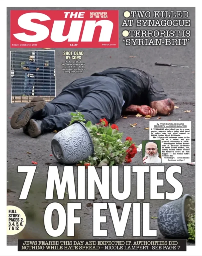 تضع «رعب في الكنيس» وعنوانًا عن «الحاخام البطل» الذي أنقذ أرواحًا كثيرة، مع تحذير من أن المجتمع اليهودي قد يواجه موجة عنف لاحقة.