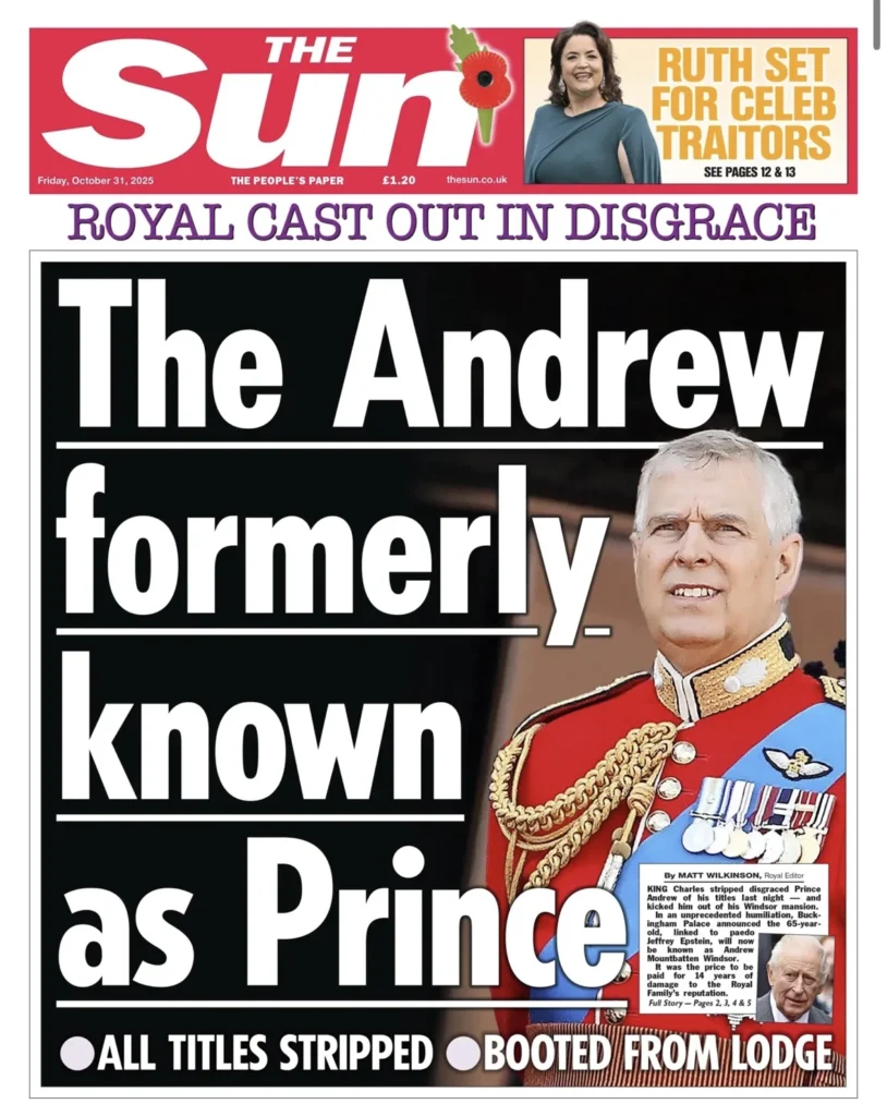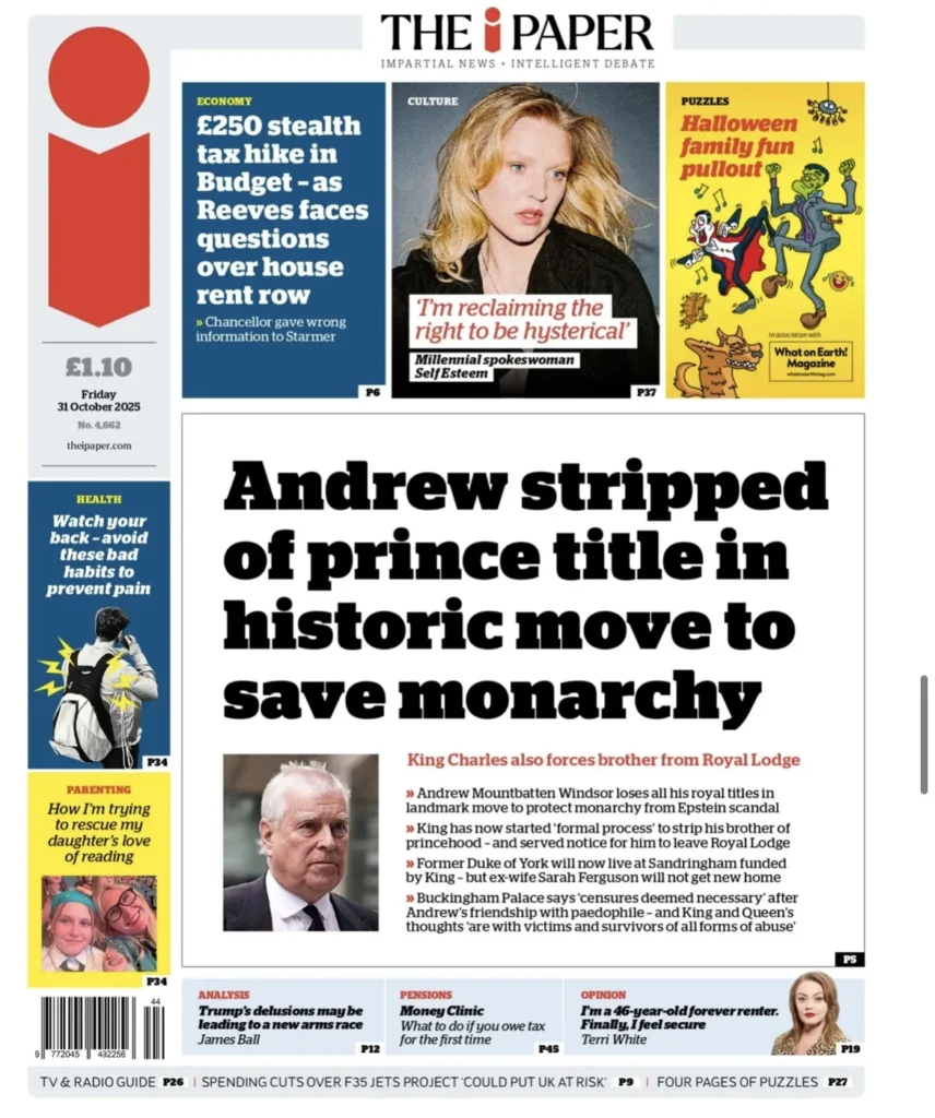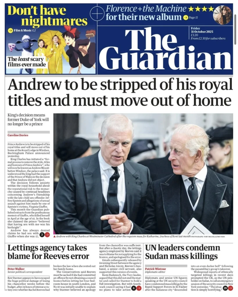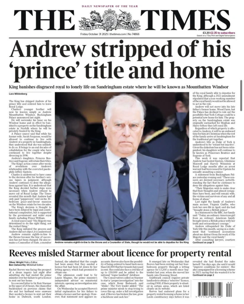 هي ليلة ملكية قاسية في وندسور. فبعد أكثر من عقد من الفضائح والاتهامات التي طاردت الأمير أندرو بسبب علاقاته بالمجرم الجنسي جيفري إبستين، أصدر الملك تشارلز الثالث قرارًا تاريخيًّا بتجريد شقيقه من جميع ألقابه وأدواره الرسمية. الخبر تصدّر الصفحات الأولى في جميع الصحف البريطانية اليوم، الجمعة 31 أكتوبر 2025، التي وصف بعضها القرار بأنه “إهانة قاسية”، فيما رأت بعض الصحف الأخرى أنه “إنقاذ متأخر للعائلة المالكة من عار دائم”.