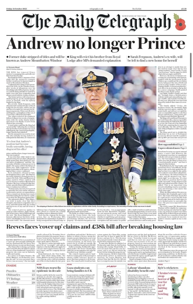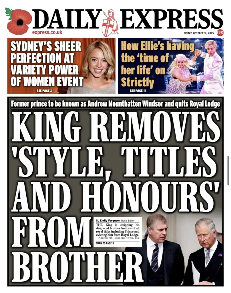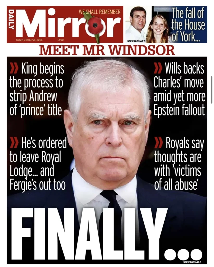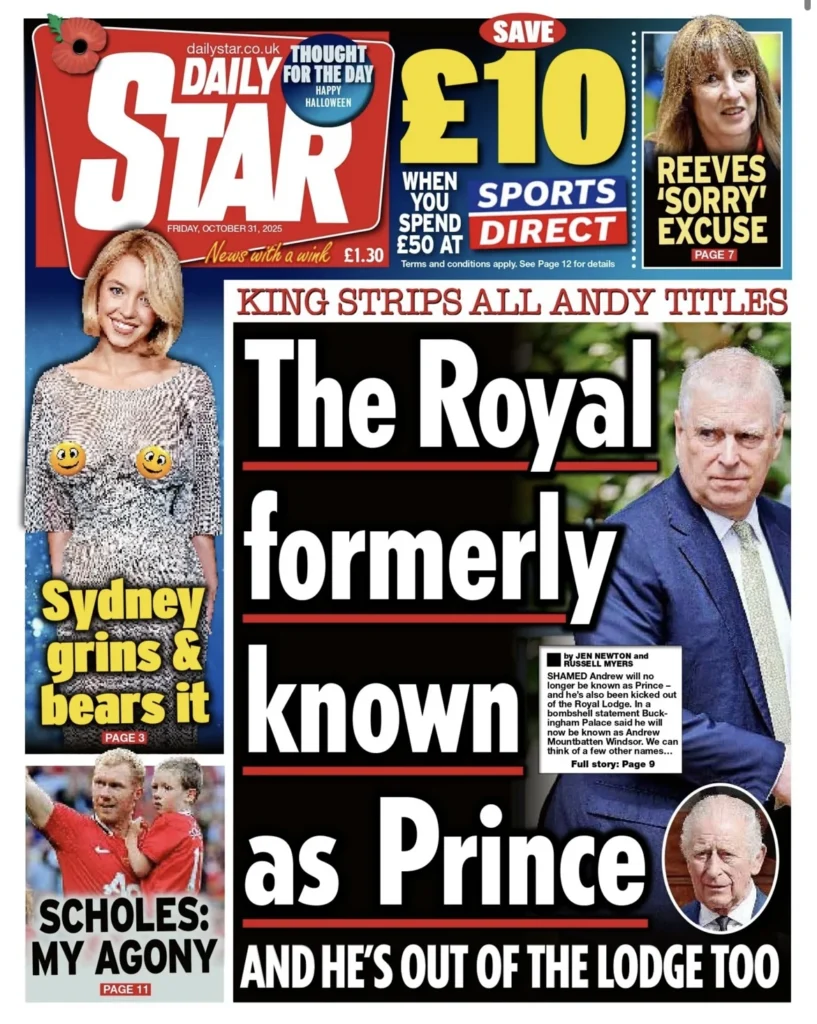 هي ليلة ملكية قاسية في وندسور. فبعد أكثر من عقد من الفضائح والاتهامات التي طاردت الأمير أندرو بسبب علاقاته بالمجرم الجنسي جيفري إبستين، أصدر الملك تشارلز الثالث قرارًا تاريخيًّا بتجريد شقيقه من جميع ألقابه وأدواره الرسمية. الخبر تصدّر الصفحات الأولى في جميع الصحف البريطانية اليوم، الجمعة 31 أكتوبر 2025، التي وصف بعضها القرار بأنه “إهانة قاسية”، فيما رأت بعض الصحف الأخرى أنه “إنقاذ متأخر للعائلة المالكة من عار دائم”.