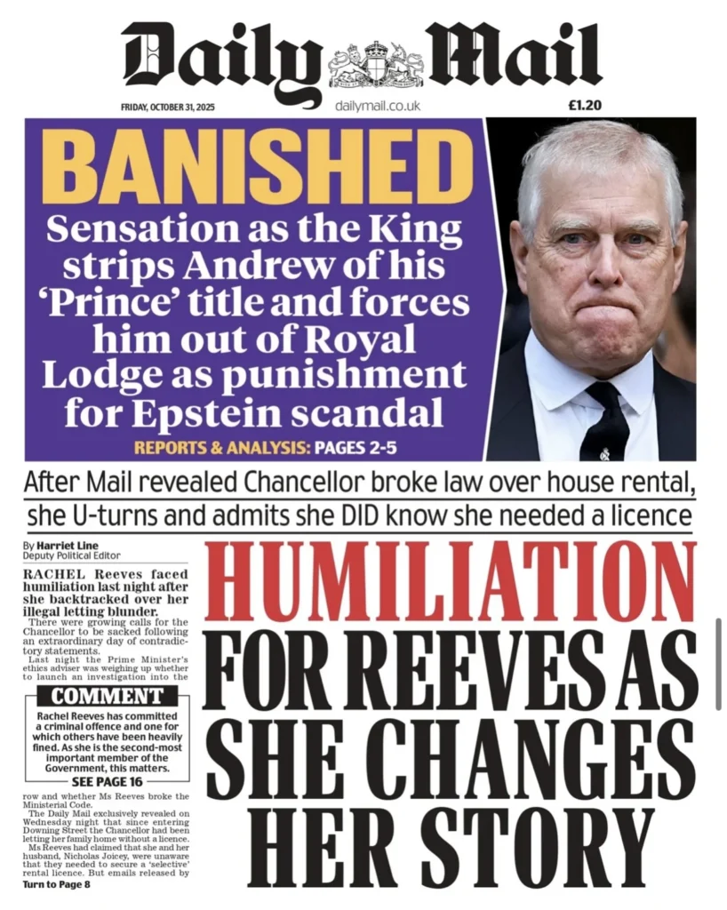 رغم إدراجها صورة لأندرو، ركزت الصحيفة على فضيحة وزيرة الخزانة رايتشل ريفز، التي أقرت بأنها أجّرت منزلها دون ترخيص قانوني، ووصفت الحادثة بأنها “إحراج سياسي لستارمر وحزبه”.