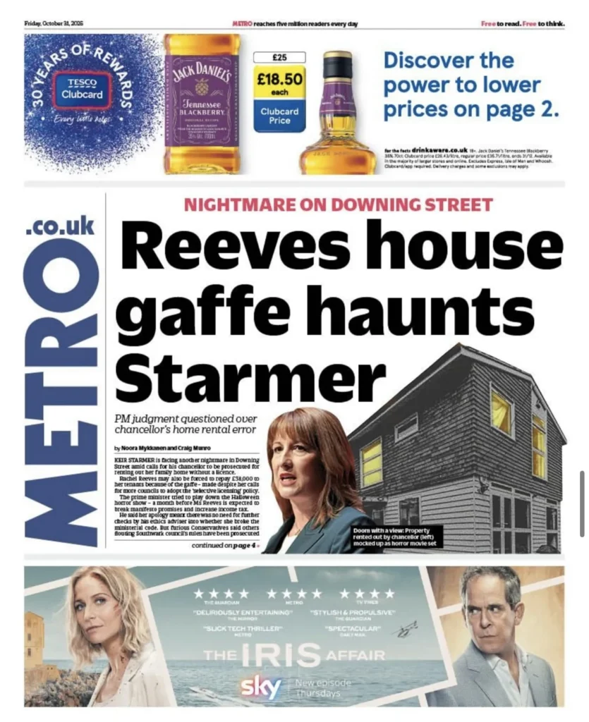 عنونت بسخرية: “خطأ منزل ريفز يُطارد ستارمر”، مع صورة للمنزل وتعليق لاذع: “منظر للعقاب”.