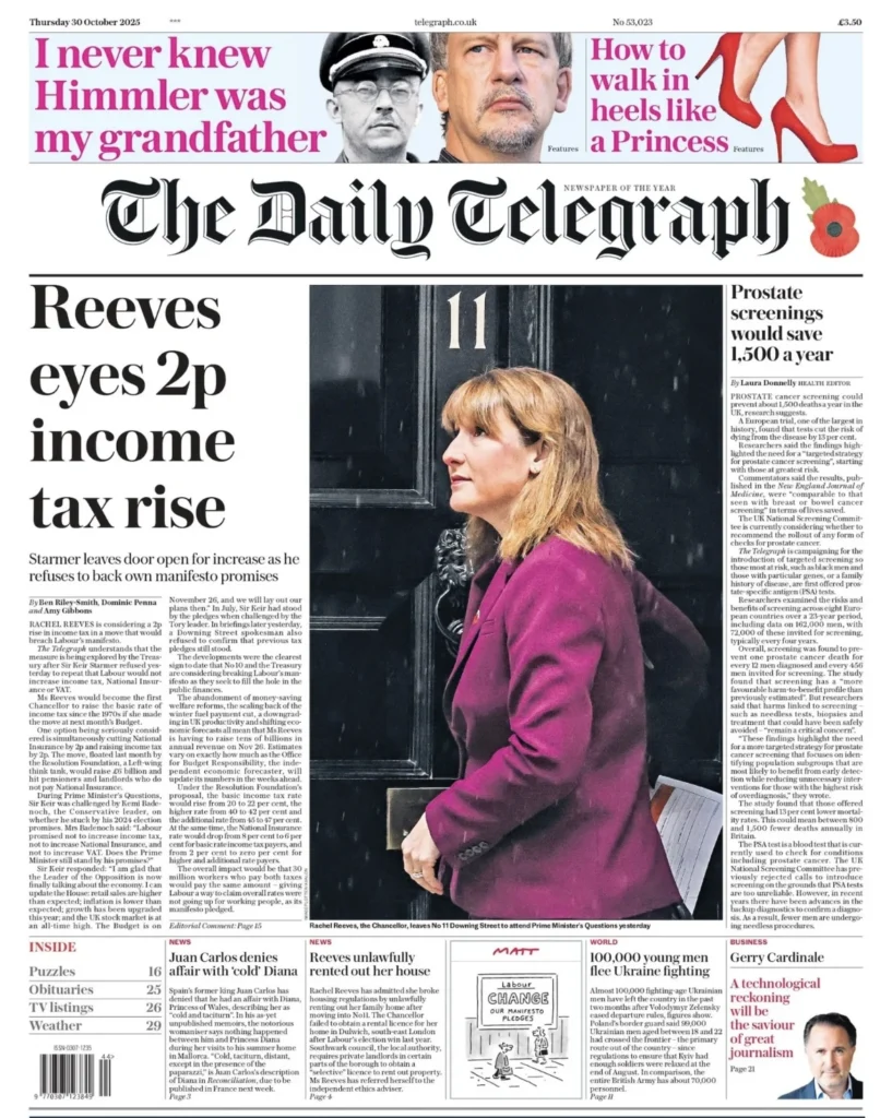 وزيرة المالية راشيل ريفز تدرس إجراء زيادة قدرها بنسان (2p) على شريحة ضريبة الدخل الأساسية للمرة الأولى منذ السبعينيات. أُشير أيضًا إلى مغادرة نحو 100 ألف شاب أوكراني بعد تخفيف قواعد السفر.