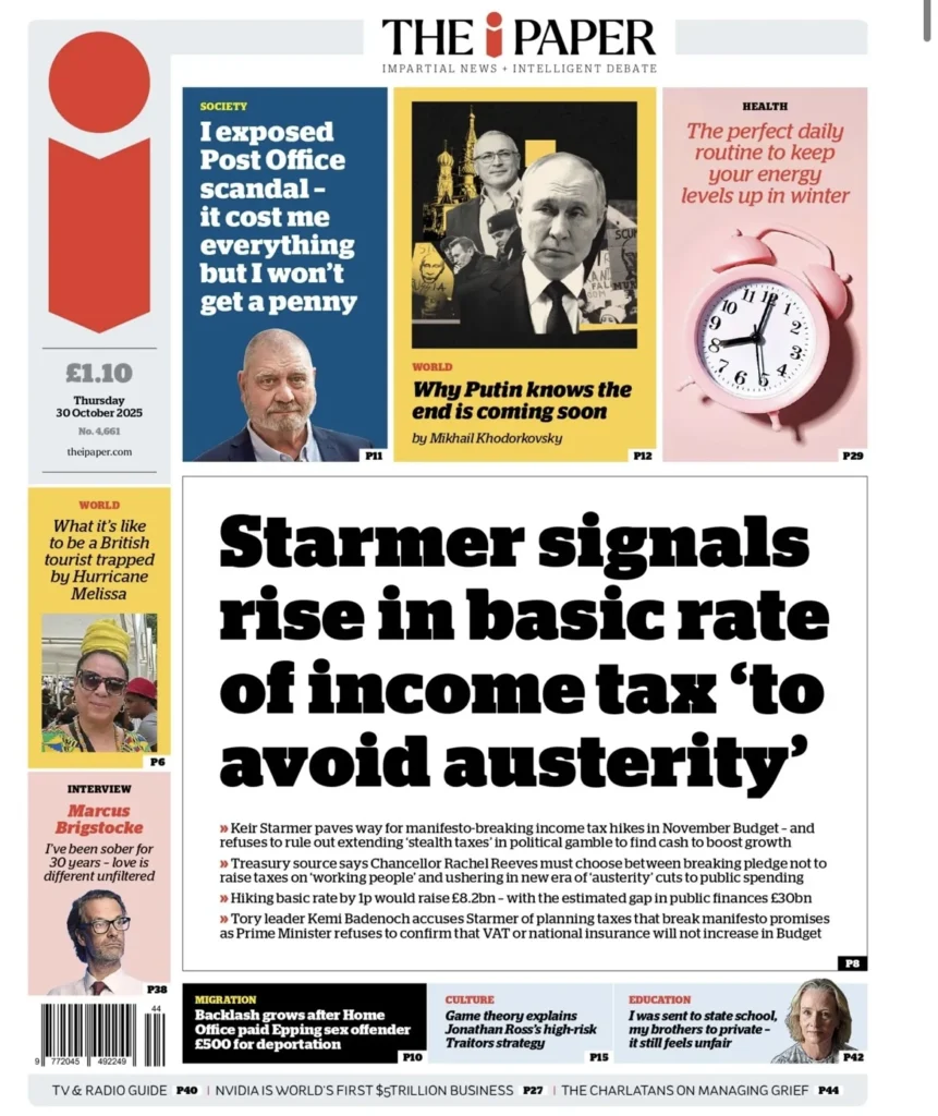 كير ستارمر مهّد لزيادات ضريبية وُصِفَت بـ«المغامرة السياسية» لتوفير موارد تدعم النمو. الصحيفة نقلت شهادات لسيّاح بريطانيين عالقين في الكاريبي بسبب إعصار «ميليسا».