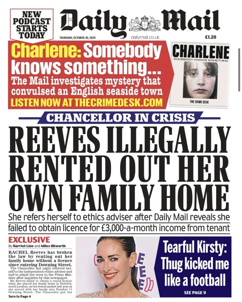 ركزت الصحيفة على اعتراف ريفز بتأجير منزل عائلتها من دون رخصة إسكان قانونية، مع اعتذار صدر عنها وتأكيد رئيس الوزراء الرغبة في إغلاق الملف، فيما اعتُبر الموقف «أزمة» سياسية لوزيرة المالية.