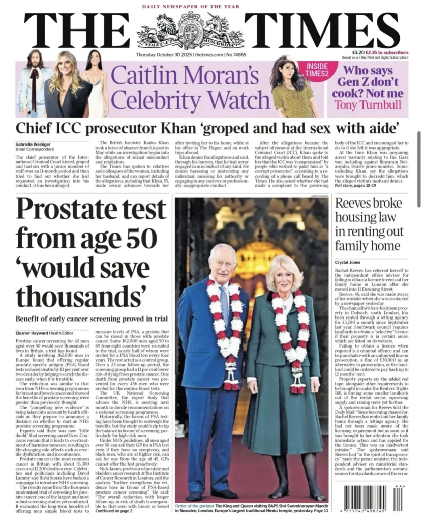 تجربة سريرية على 162 ألف رجل أظهرت أنّ الكشف المبكر عن سرطان البروستات خفّض الوَفَيات بنسبة 13 في المئة. أُبرِزت صورة للملك تشارلز الثالث والملكة كاميلا خلال زيارة معبد هندوسي في لندن.
