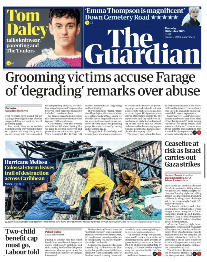 خمس ناجيات من عصابات استغلال جنسي اتّهمن زعيم «ريفورم يو كيه» نايجل فاراج بإطلاق تصريحات «مهينة» بشأن قضاياهن. وأُرفق التقرير بصورة من كوبا بعد انتقال إعصار «ميليسا» إليها.