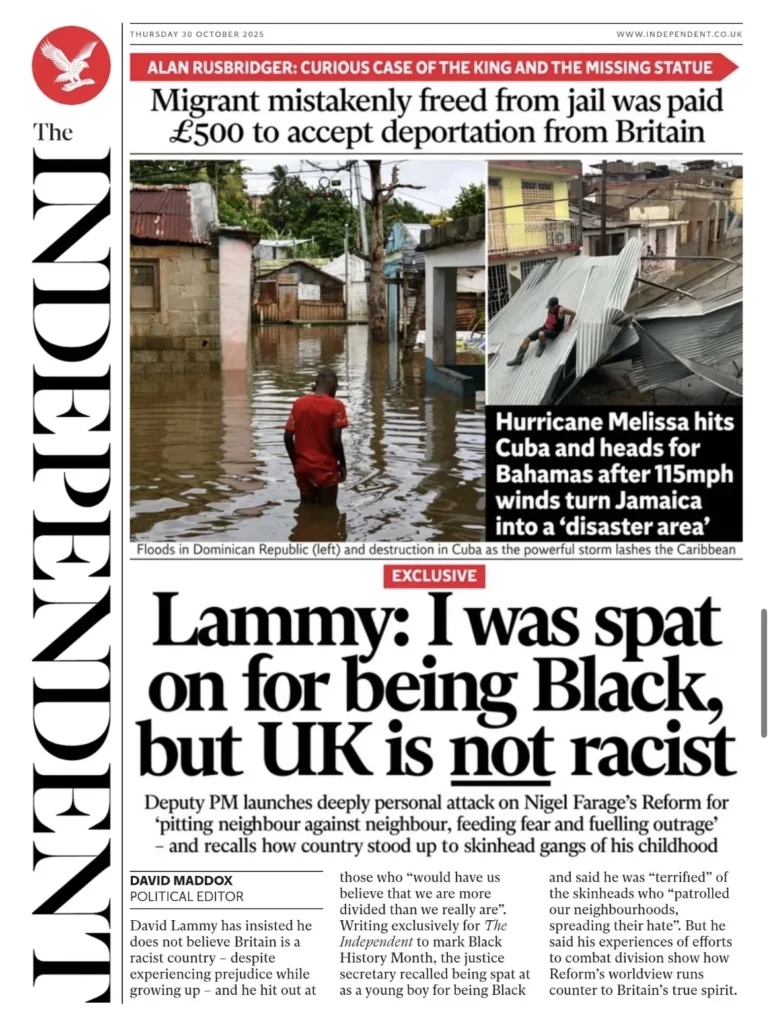 أبرزت الصحيفة صورًا واسعة لآثار الدمار في جامايكا. وزير العدل ديفيد لامي روى قصة تعرّضه للبصق «بسبب لون بشرته» مع تأكيده أنّ بريطانيا ليست بلدًا عنصريًّا، وهاجم «ريفورم يو كيه» لما عُدّ «تحريضًا بين الجيران وتأجيجًا للغضب».