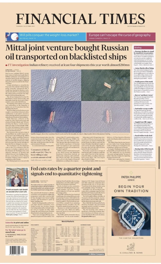 تحقيق عن شراكة طاقة مرتبطة برجل الصلب لاكشمي مِتّال اشترت ما يقارب 280 مليون دولار من النفط الروسي المنقول على سفن مُدرجة على قوائم العقوبات. في الولايات المتحدة، الاحتياطي الفدرالي خفّض الفائدة بمقدار ربع نقطة مئوية في إشارة إلى اقتراب نهاية التشديد الكمي.