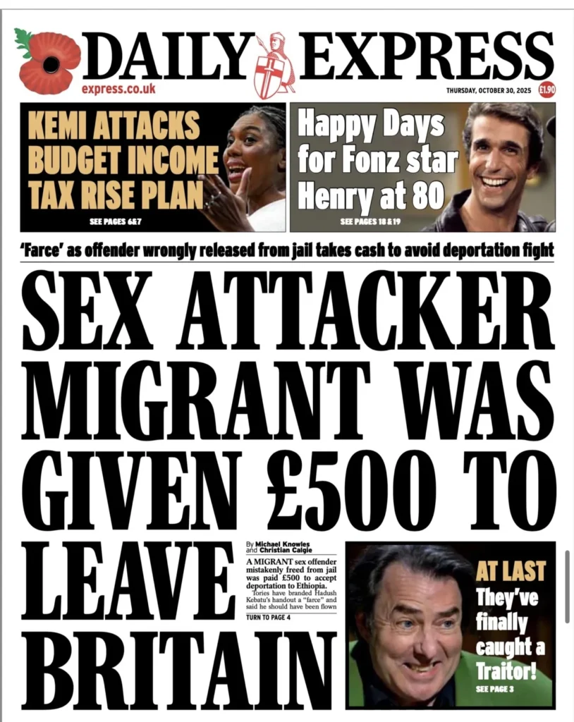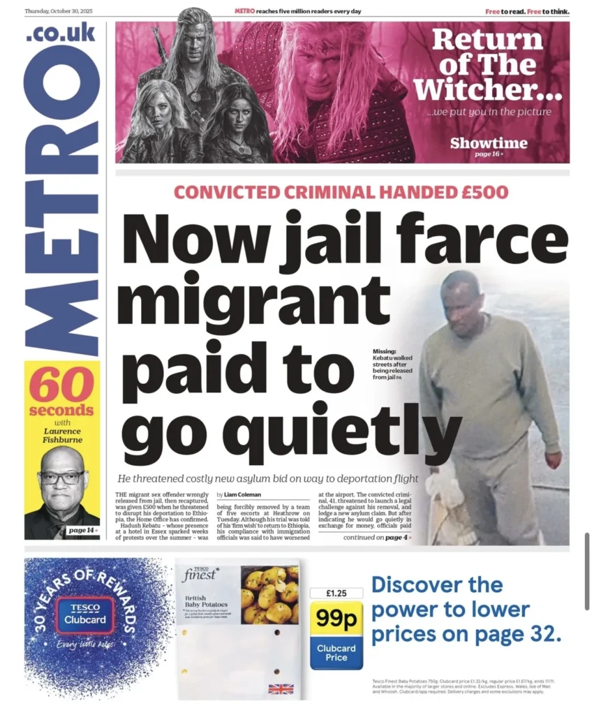 ذكرت الصحيفة قصة المهاجر المُدان حدوش كباتو الذي حصل على 500 باوند بعد تهديده بتعطيل ترحيله إلى إثيوبيا؛ إذ أُطلق سراحه عن طريق خطأ إداري قبل إعادة توقيفه الأحد.