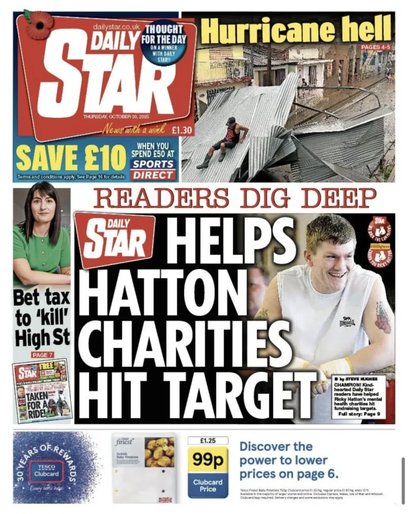 أبرزت الصحيفة حملة دعم لهيئات خيرية تحمل اسم الملاكم الراحل ريكي هاتون، والإشادة بوصول التبرعات إلى الهدف.