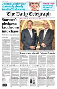 ذكرت أن وعود حزب العمال الضريبية تعاني من “فوضى” في ظل فجوة مالية تُقدَّر بـ51 مليار باوند. رئيس الوزراء كير ستارمر أكد أن المستشارة ستعرض الميزانية لاحقًا هذا العام، لكنه لم يعِد بعدم رفع ضريبة الدخل أو التأمين الوطني أو ضريبة القيمة المضافة. كما أبرزت الصحيفة إزالة هيئة الإذاعة البريطانية لفقرة المزاح من برنامج “ماستر شيف” الذي يقدّمه جون تورود وغريغ والاس.
