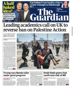 كشفت عن مطالبة أكاديميين الحكومة البريطانية بإلغاء الحظر على مجموعة “Palestine Action”، محذّرين من آثاره على الجامعات في بريطانيا والعالم. وتصدّرت الصفحة الأولى صورة لعائلات فلسطينية تفرّ من قصف على غزة.